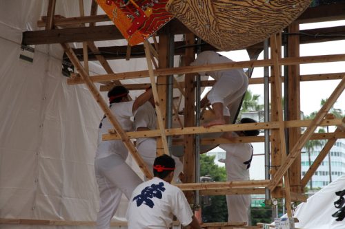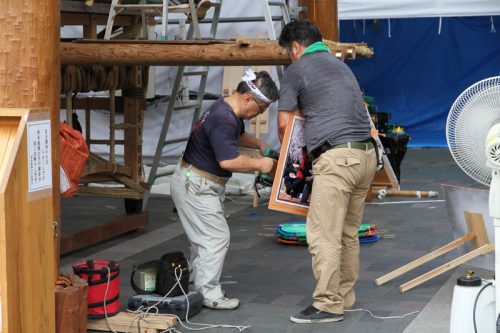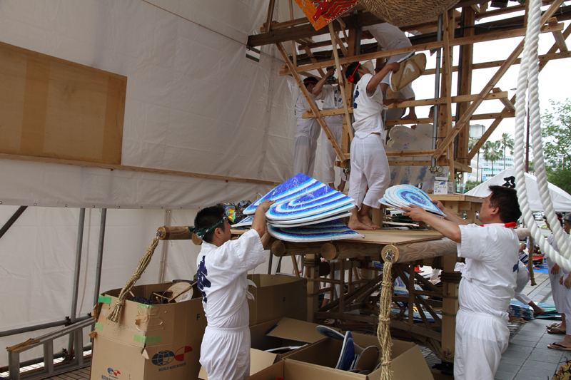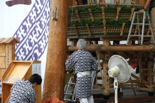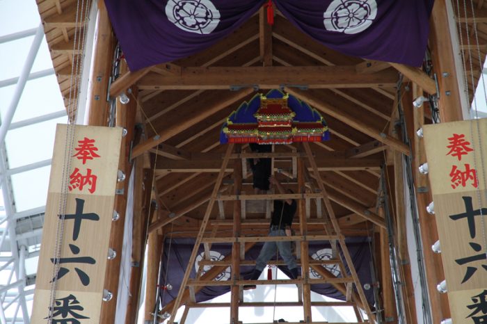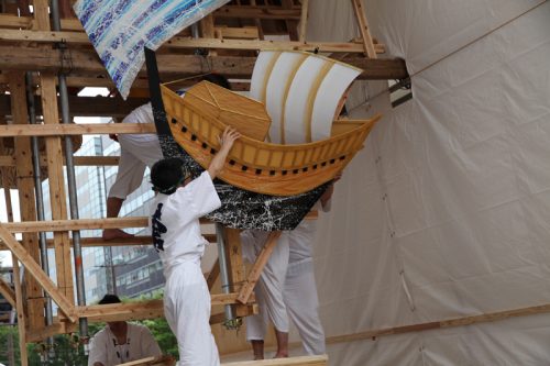 見送りに取り付けられる舟の飾り。裏から見ると、東流の男衆が指示に合わせて飾りを据え付けていることがよくわかります。