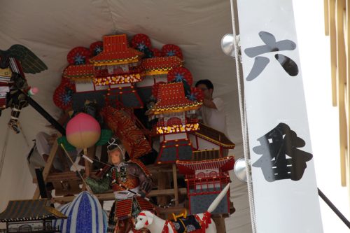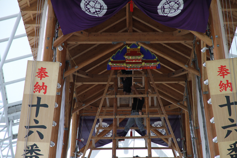 いよいよ人形が矢切に上げられていきます。まずはゴリけんさんの人形が山に据えられ、斎藤さん・矢野さんも次々と上げられて飾り山に固定されました。