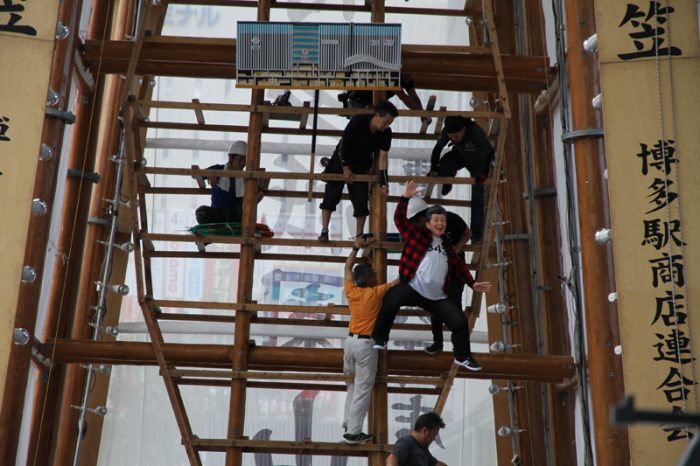 午前8時、飾り付けが始まりました。博多祇園山笠の飾り山の中でもひと際大きい博多駅の飾り山ですので、全員見上げての作業となります。