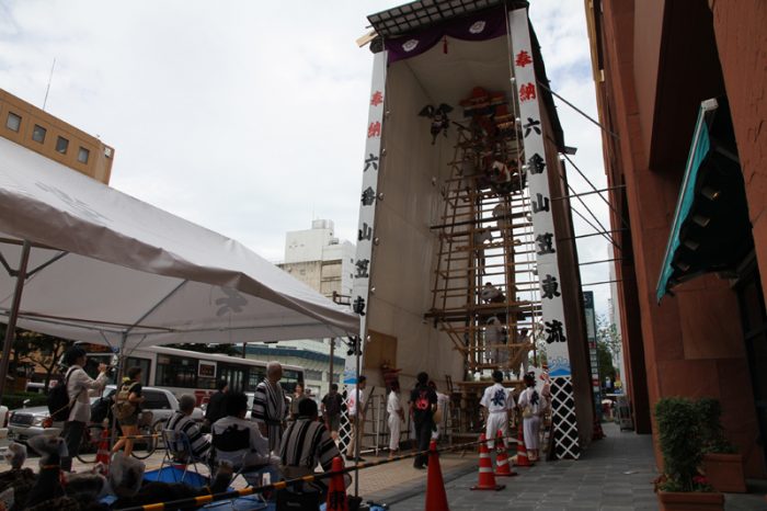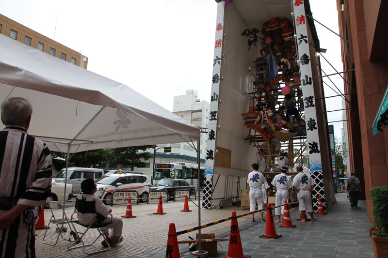 呉服町の交差点に立つ東流の飾り山も本日より飾り付けが始まりました。