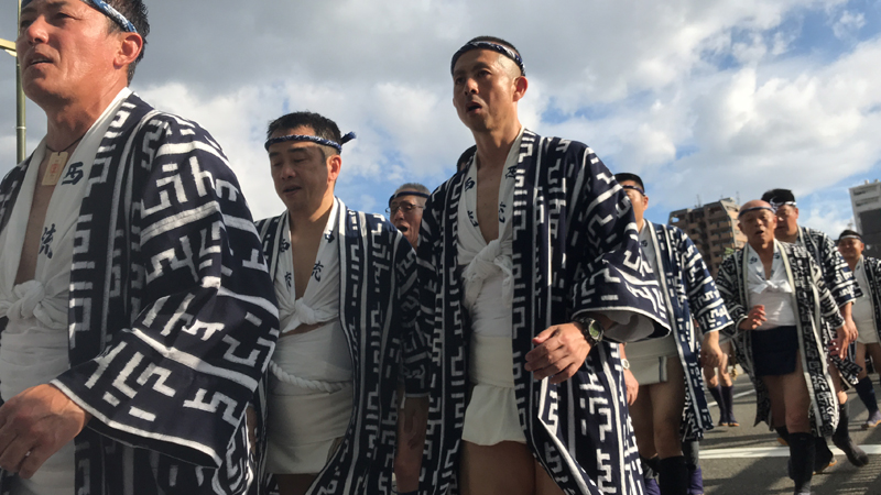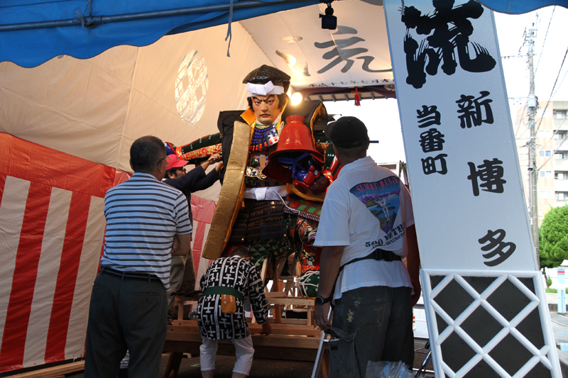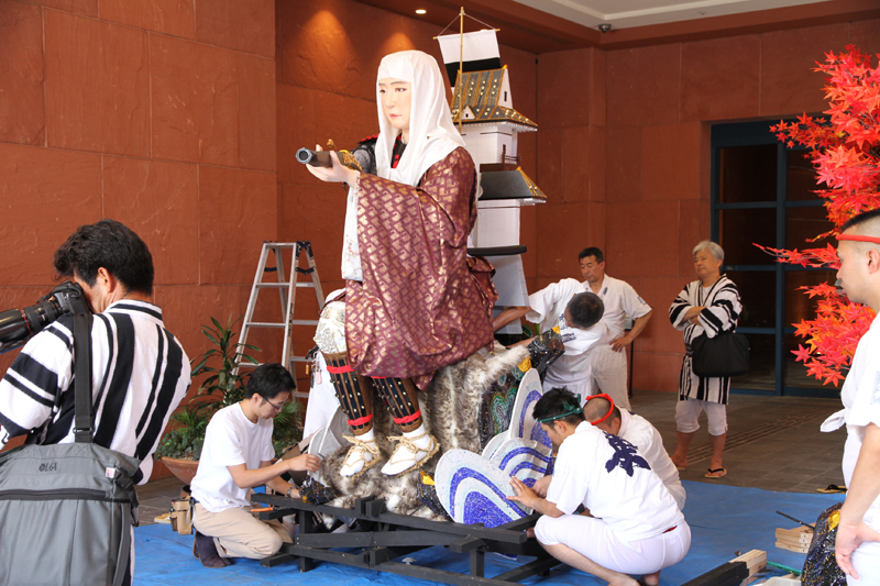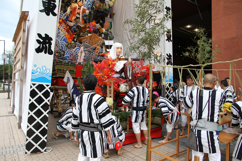 東流は昨日7月1日の午後より飾り付けを行いました。標題は「思君慈母成鬼神(きみをおもえばじぼもきしんとならん)」。うだるような暑さの中、白水人形師と山大工の手によって舁き山飾りが出来上がっていきました。
