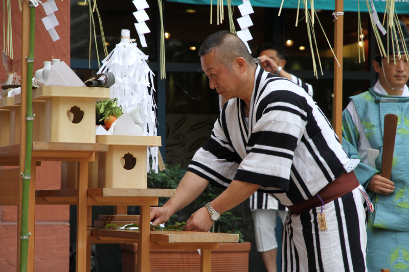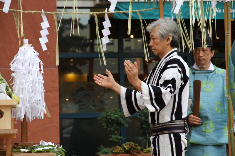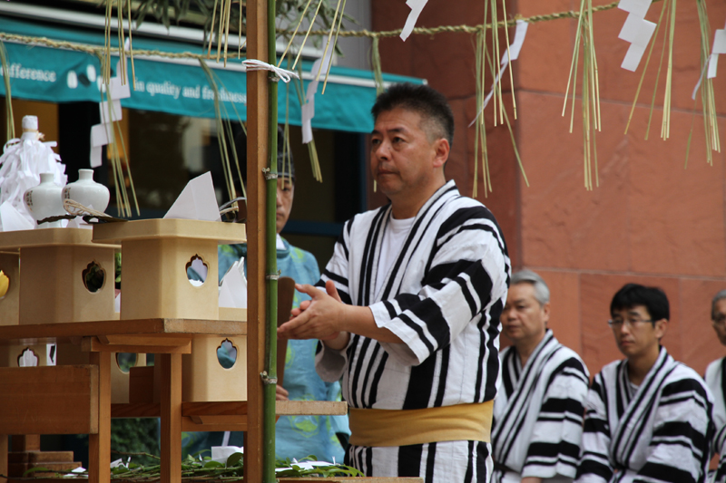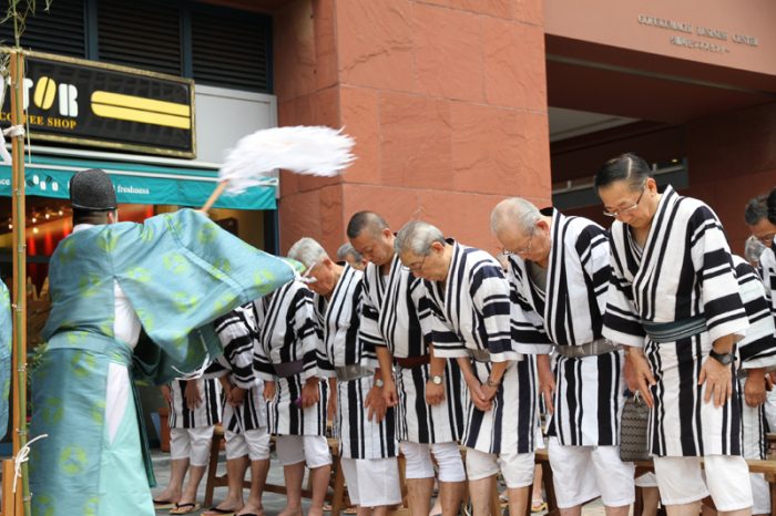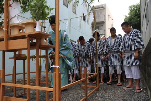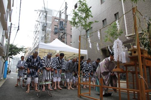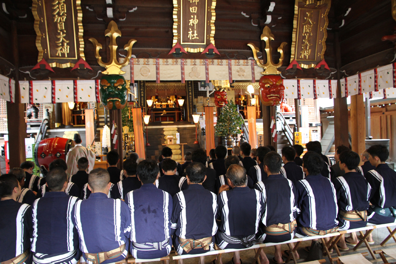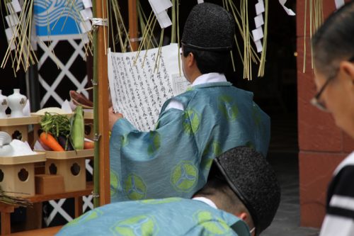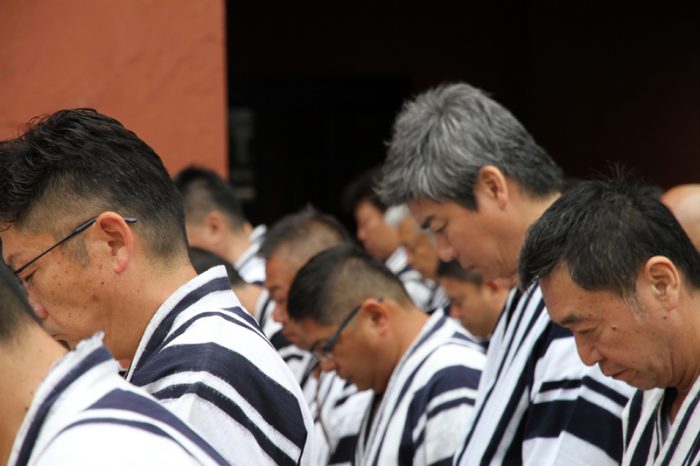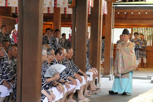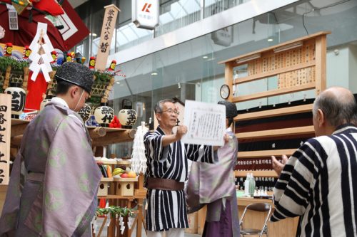 午前7時、神事が始まりました。櫛田神社の神職により参加者が祓い浄められ、祝詞奏上が行われます。