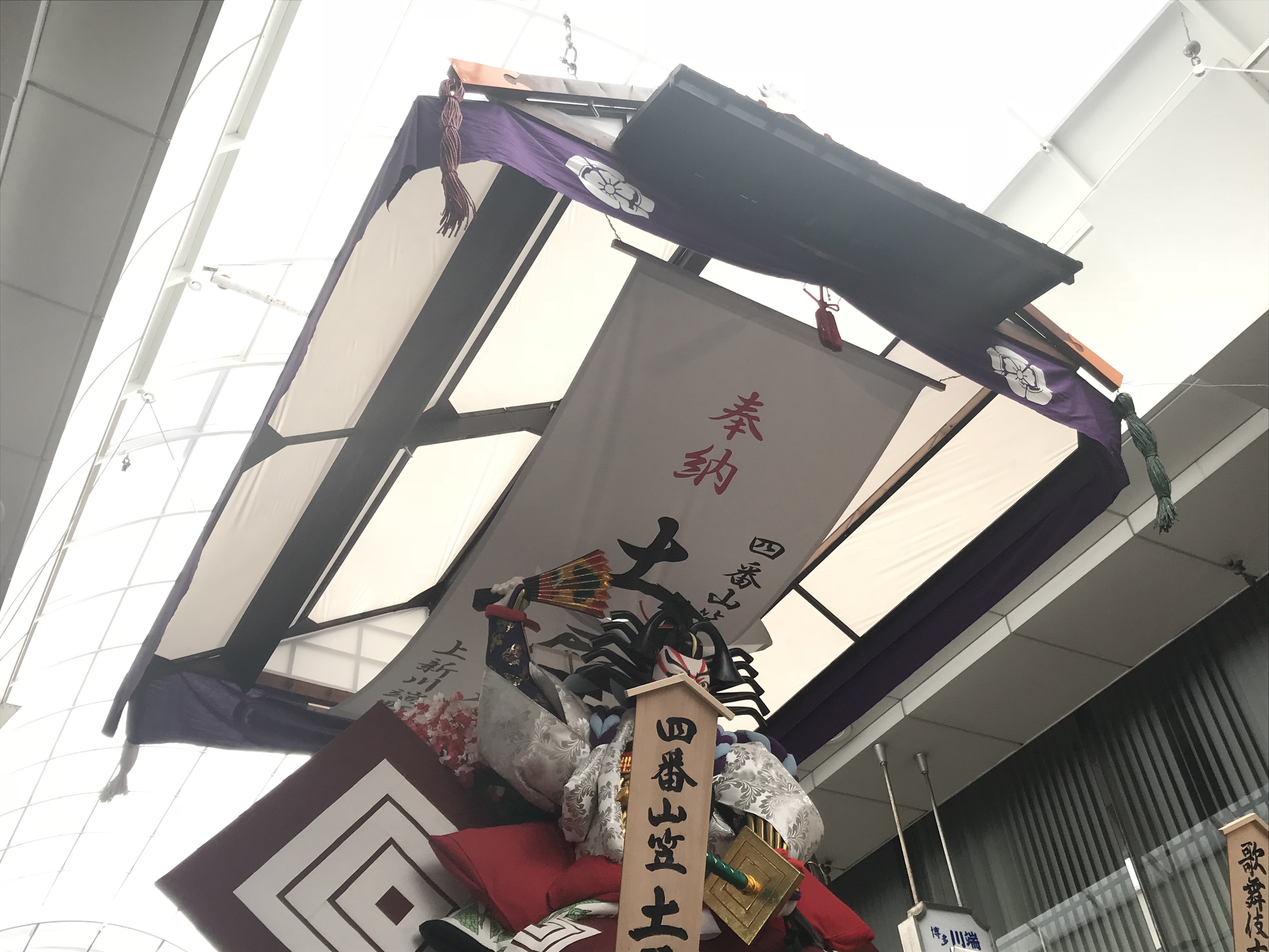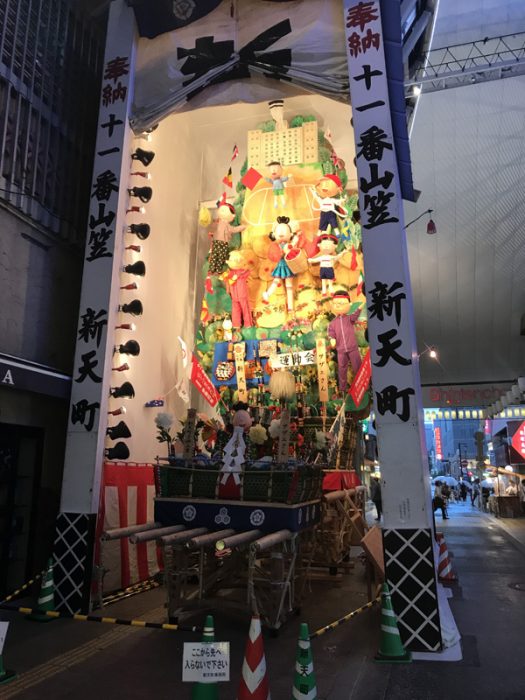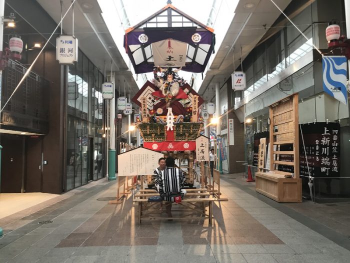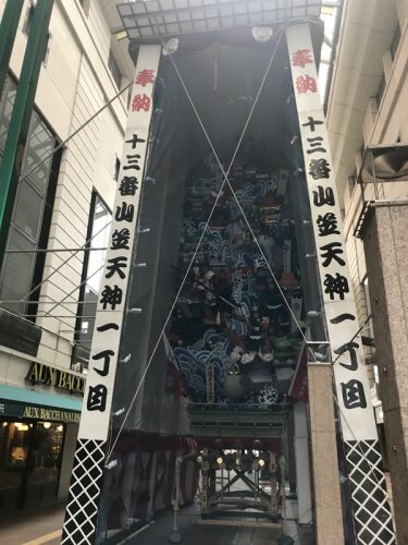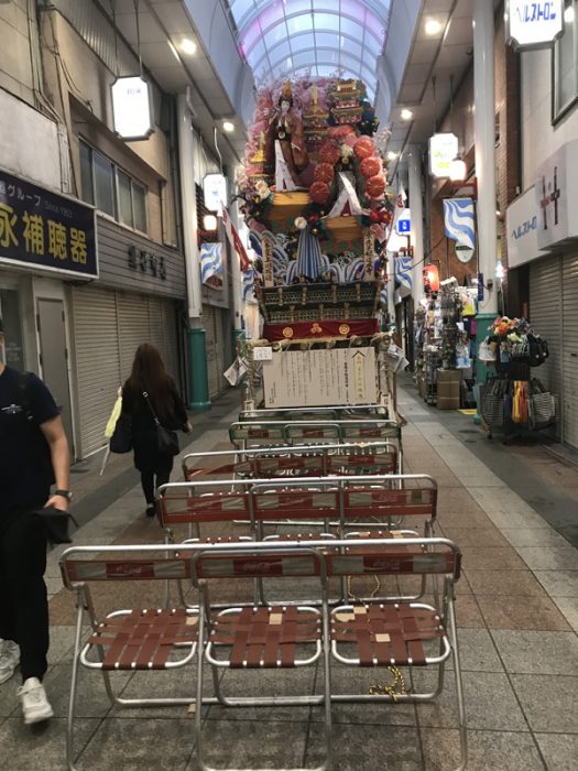 アーケードの中にある新天町は幕を開けて風に煽られないよう風通しを良くし様子を見る状況。いつもなら道側に据えられている子供山笠は、風の影響を受けるので一旦飾り山の場所に据えて台風の通過を待っていました。
