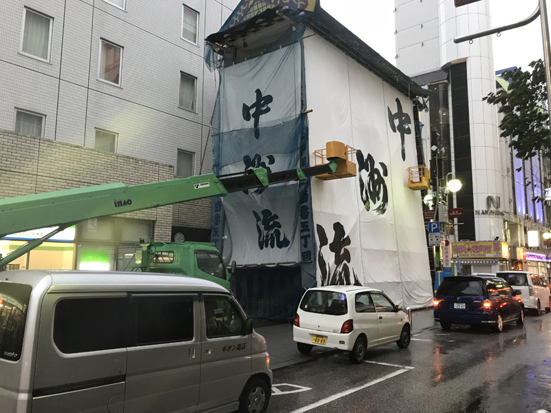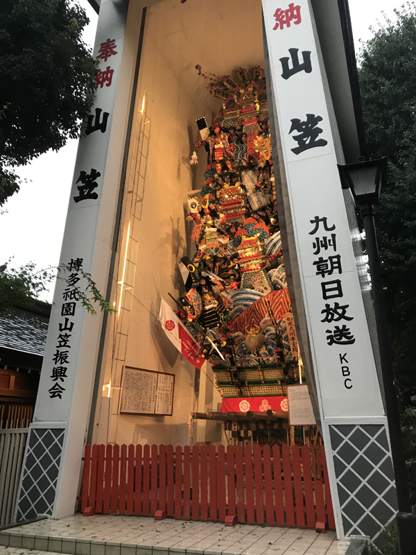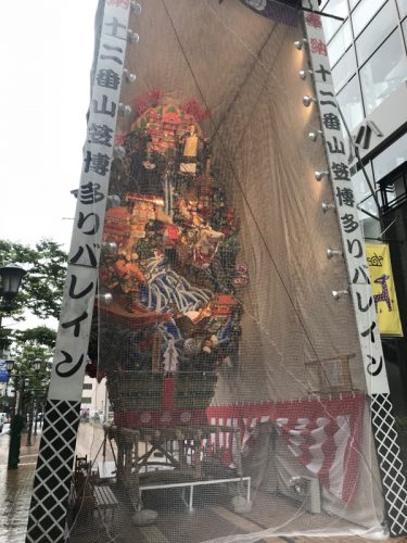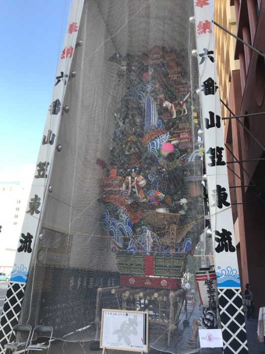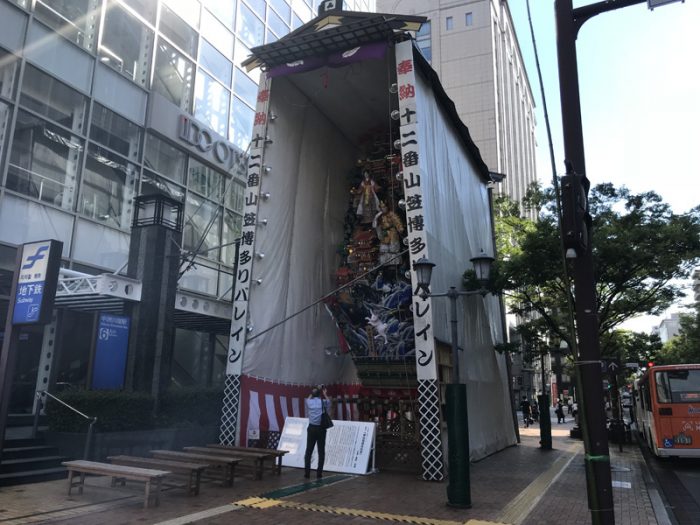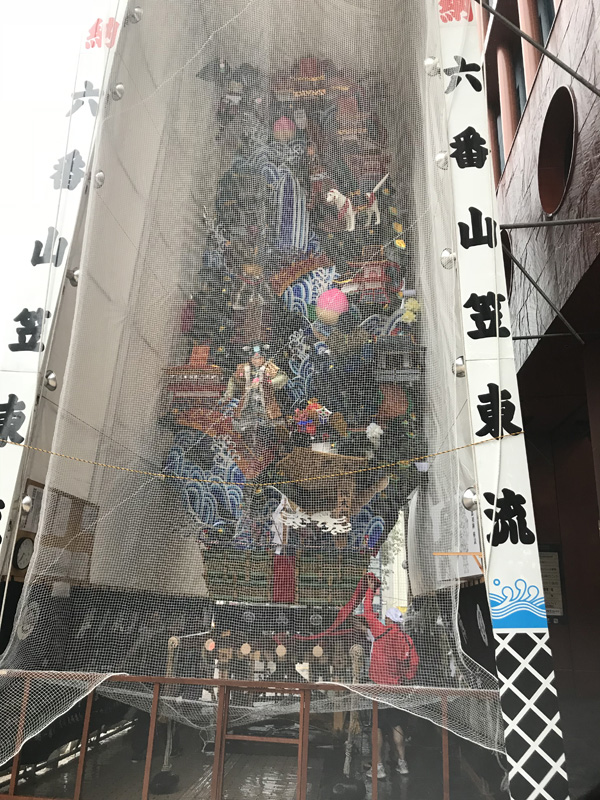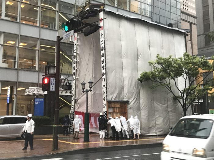一番大変な状況だった博多リバレインですが、午前八時半の段階で網幕を外し、ばんこが並べられいつもの飾り山に。何事も起きてなくてほっとしました。