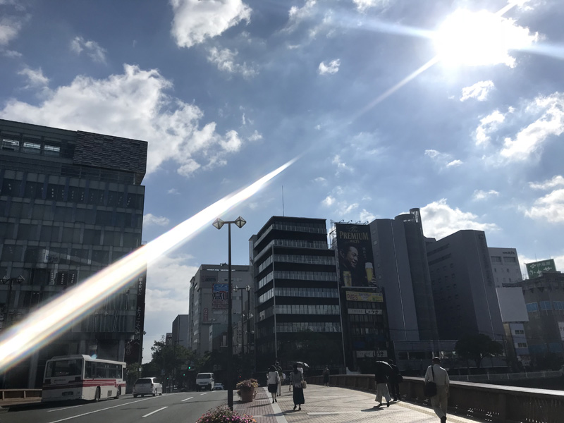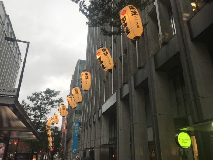 午4時あたりから風が強くなってきて、午後6時頃になると体の軸が持っていかれるような煽られるような強い雨風が吹くように。明治通りや土居通りにつるした提灯も強風で吹き飛ばされるかのように傾き、中洲大通りの提灯は接触不良になって消えている提灯もありました。台風接近のため、博多の店舗も早い時間で閉めるお店も多々あり、いつもだと帰宅途中の人やアフターファイブを楽しむ人でにぎわう博多の町は人気が大変少なく、バスにも誰も乗っていない珍しい光景に。