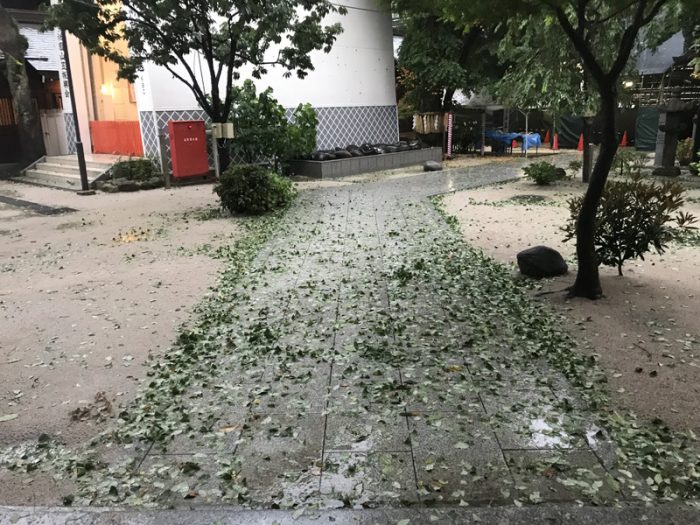 丈夫な山小屋を持つ櫛田神社は、午後6時半頃でもまだ幕を掛けることがなく展示されていました。しかし風の強さは変わらずで、地面には散乱した落ち葉や風で曲がった植木、折れた木の枝などが散乱していました。