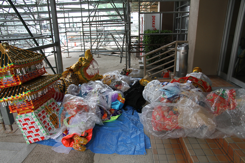 今年の櫛田神社の表の標題は「神話海幸彦と山幸彦(しんわうみさちひことやまさちひこ)」。山小屋の周辺には、山笠飾りの人形やパーツがずらりと並べられており、人形はまだ顔を隠した状態で準備を待っていました。間近で見ると様々な飾りの細かさに目を奪われます。
