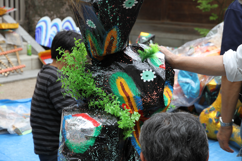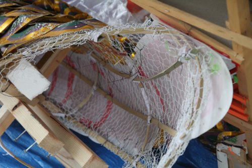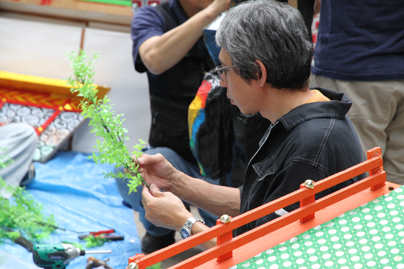 岩こぶ飾りに草を這わせ、そして穴をあけて雑草を差し込みます。下から見たら気づくか気づかないかの小さな飾りかもしれないのですが、こういった人形師のリアリティへのこだわりが奉納物としての飾り山の見事さを引き立てます。まさに「細部に神は宿る」。