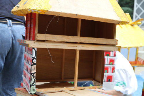 先日地鎮祭を行った東流では、舁き山の山小屋の建設がスタート。今年より舁き山が山小屋に据えられます。夕方前には建設が完了。こちらも準備が進んでいます。