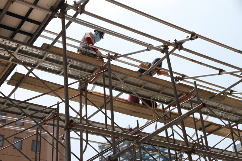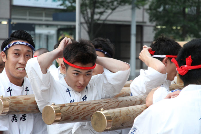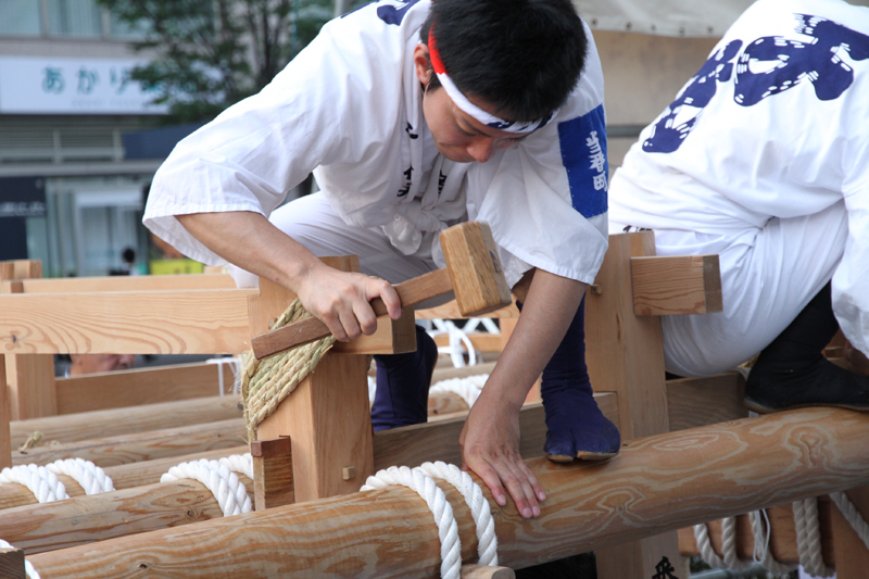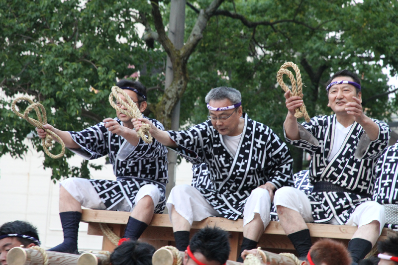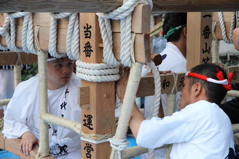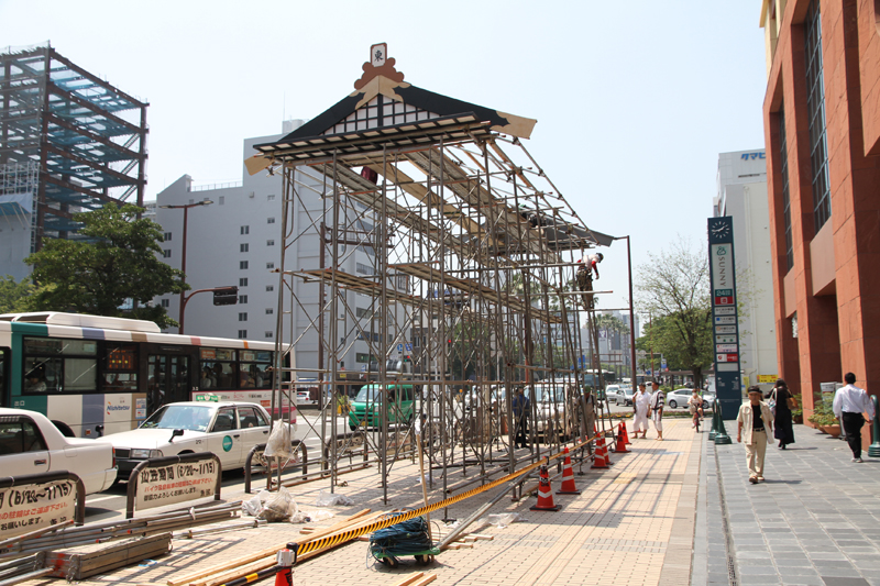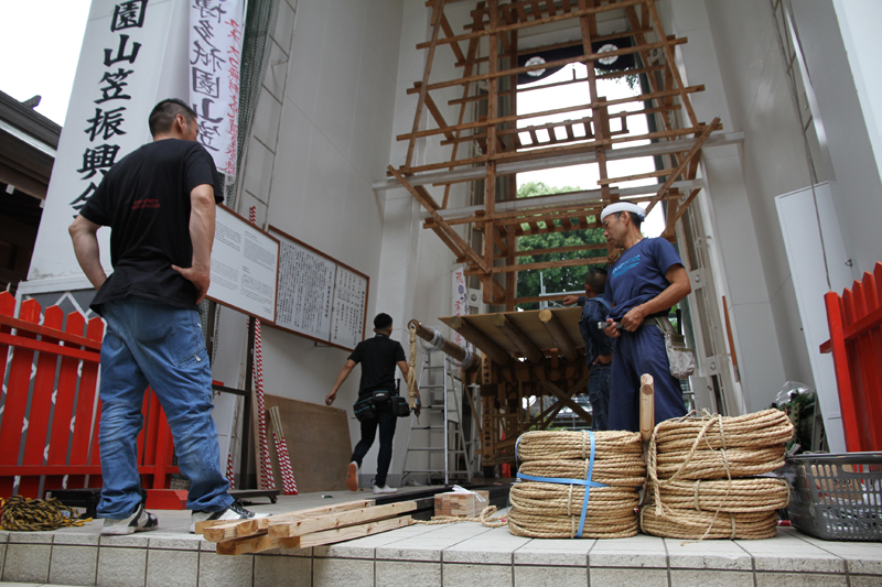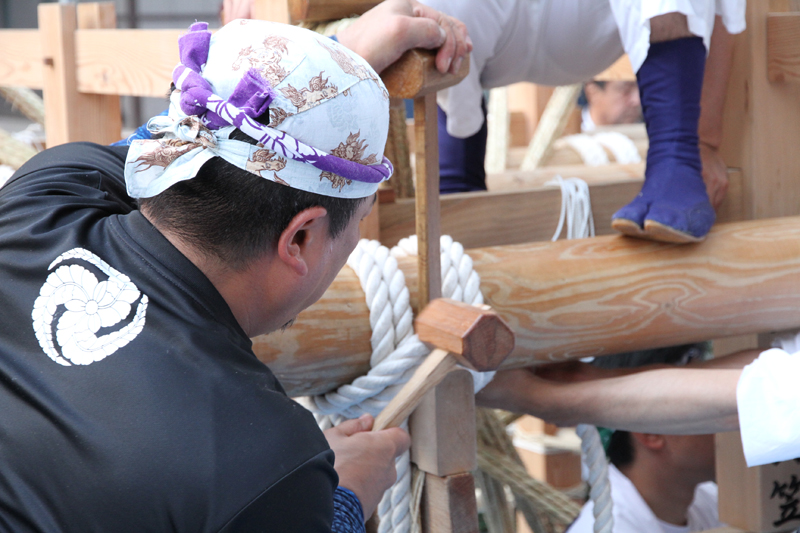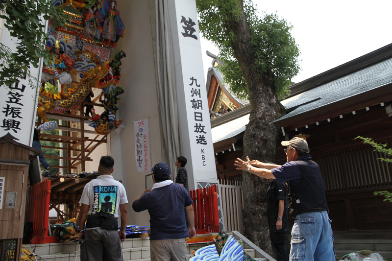 今日は蒸し暑いうえ、日差しが強い一日となりました。飾り付けを行う人形師、山大工らは汗を浮かべながら、今年最初の飾り付け作業を行いました。