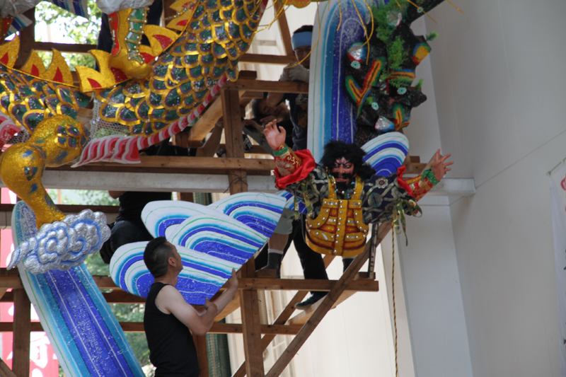「もう少し浜側に差しむことできませんかね?」と川崎人形師が、飾り山に登った山大工に飾り付けの際に使われる左右を示す符丁を使いながら、飾り山の下からバランスを見ながら飾りの指示をします。山大工もそれに合わせて、飾りを配置していきます。