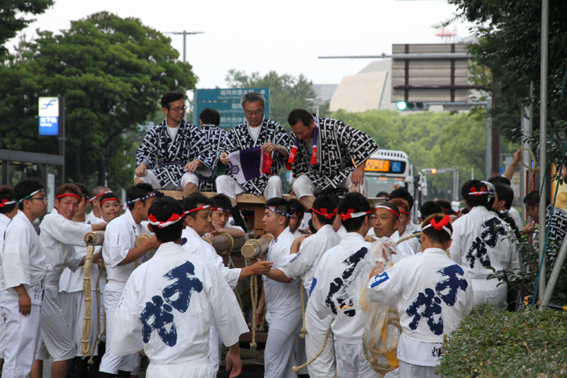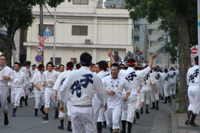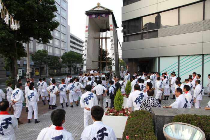 舁き棒に男衆が付き、舁き縄を掛けられ、山笠台が道路に引き出されます。山笠台が動き出すと、場に独特の高揚感が漂い始めます。