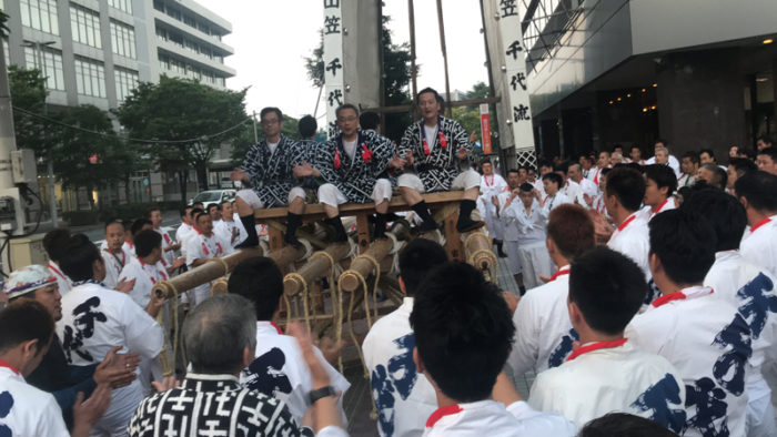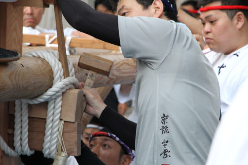 山笠台に舁き棒が締められると、山笠台に枝折(しおり)と呼ばれる天板が乗せられます。棒締めが終わったら棒の締まり具合を確認する「試し舁き」が行われるのです。