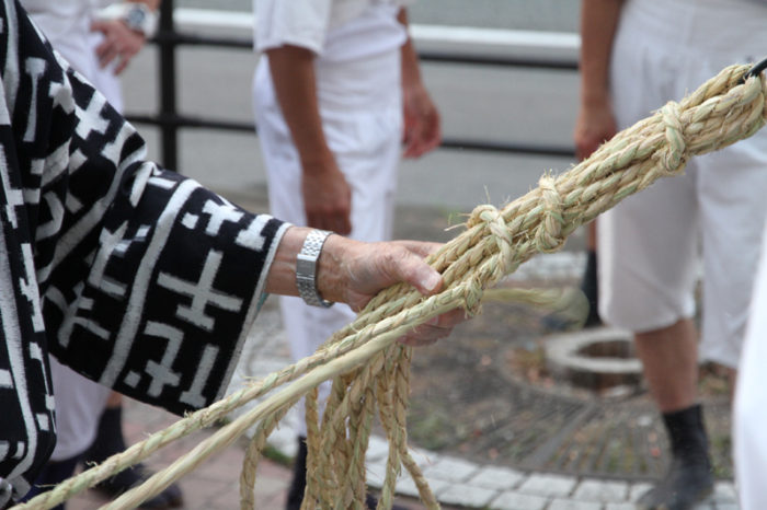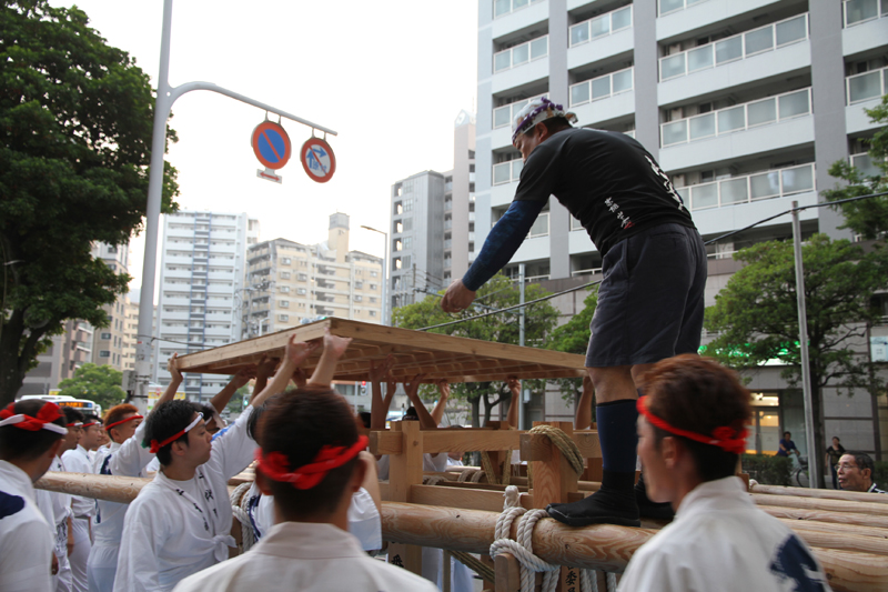 まだ飾りがない山笠台に台上がりが座ります。手には指揮棒となる鉄砲の代わりに舁き縄が持たれています。