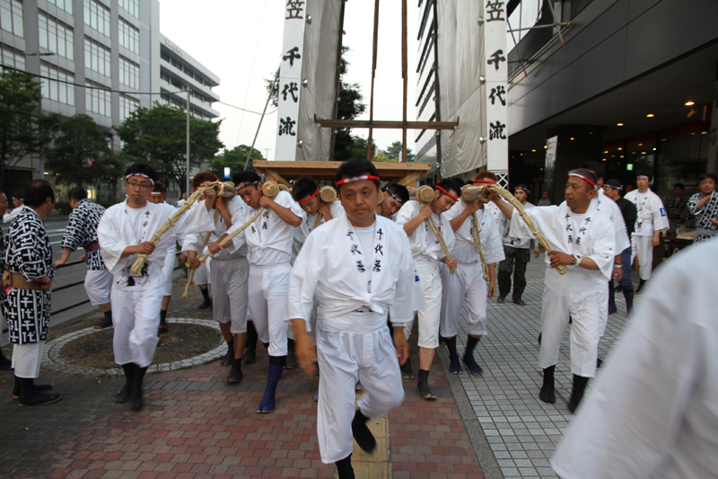 千代流は、午後6時より飾り山の山小屋前で飾り山の棒締めを行いました。棒締めにはたくさんの千代流の男衆が参加しました。
