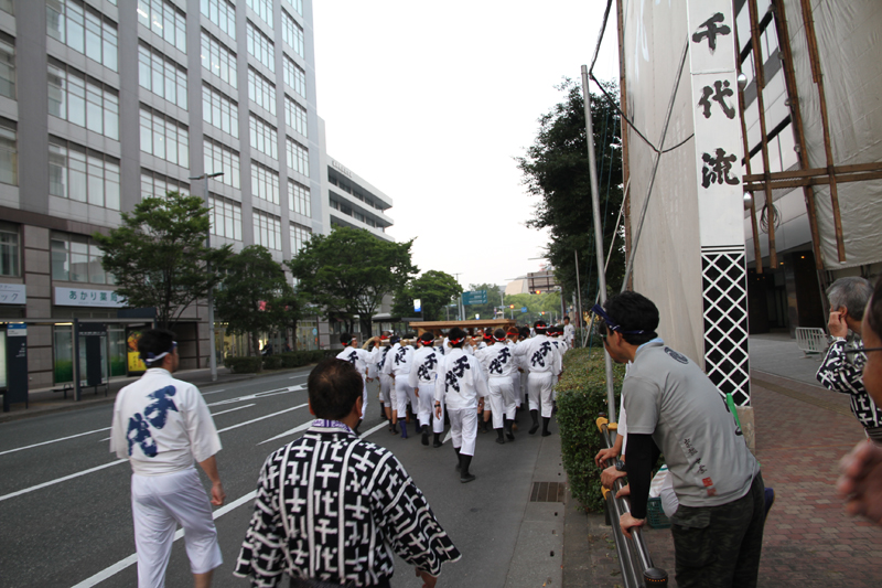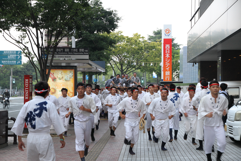信号が青になるのを待って、祝いめでたが謡われます。祝いめでたを謡いながらスタートする千代流だけの舁き出しです。突然始まった山笠にバスに乗っている人もびっくりした表情で窓の外を見つめる中、最後の♪ショーンガネーが終わるや否や、「ヤァァァァァ!」の鬨の声と共に山笠台が走り始めました。