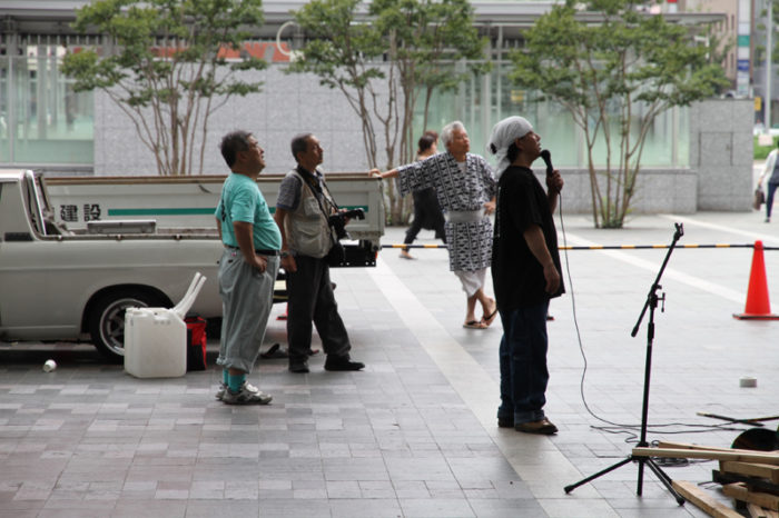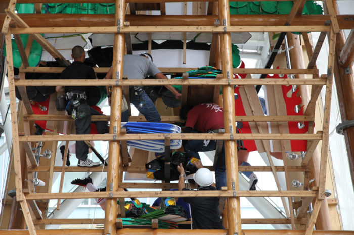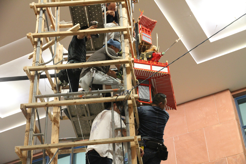 その指示に合わせて、博多駅の飾り山の特徴である高い高い矢切に上った山大工らが、指示に合わせて飾りの角度や位置を変更していきました。