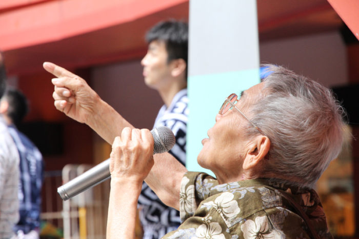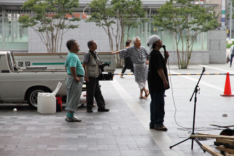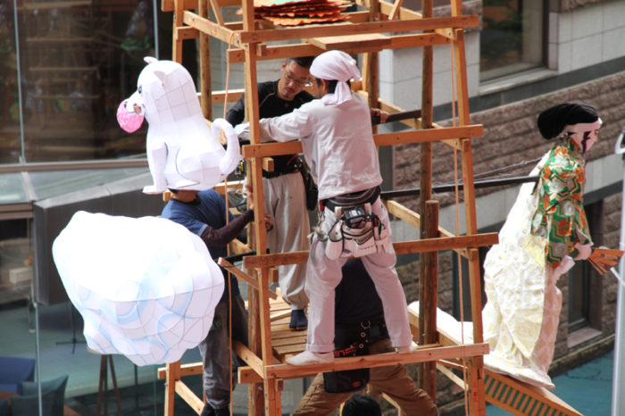 山小屋の下から田中人形師がマイクを使って飾りの指示を行っていきます。
