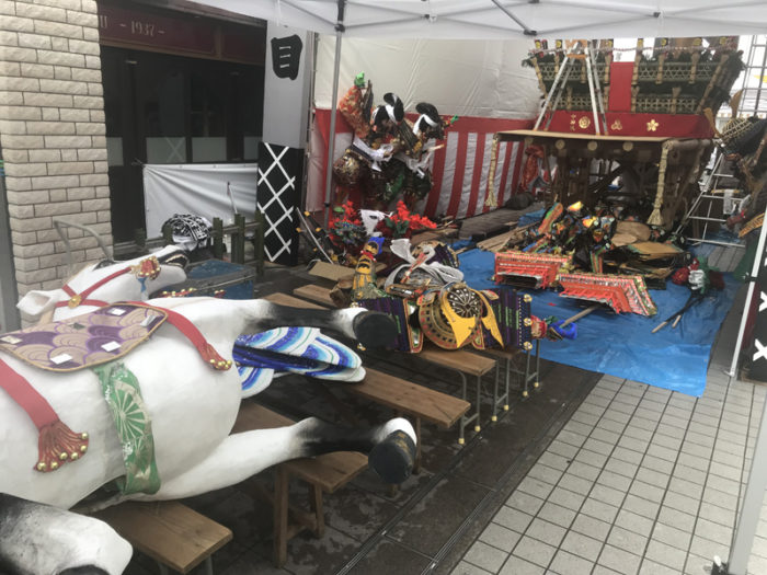 舁き山の山小屋は、を一時的に飾り山の飾りを置く場所に。この日に飾り付ける予定の大きな人形や館が並べられ、飾り付けの順番を待っていました。
