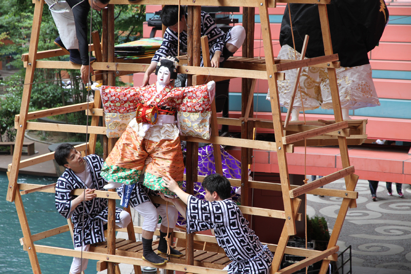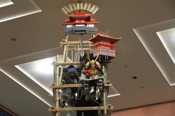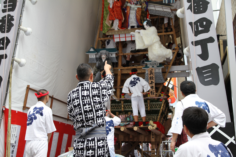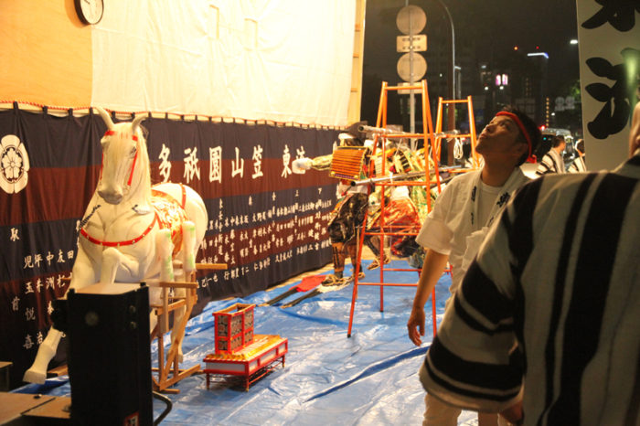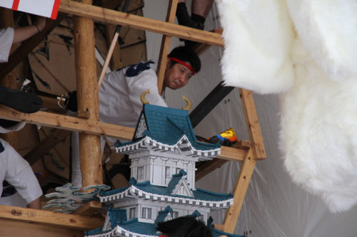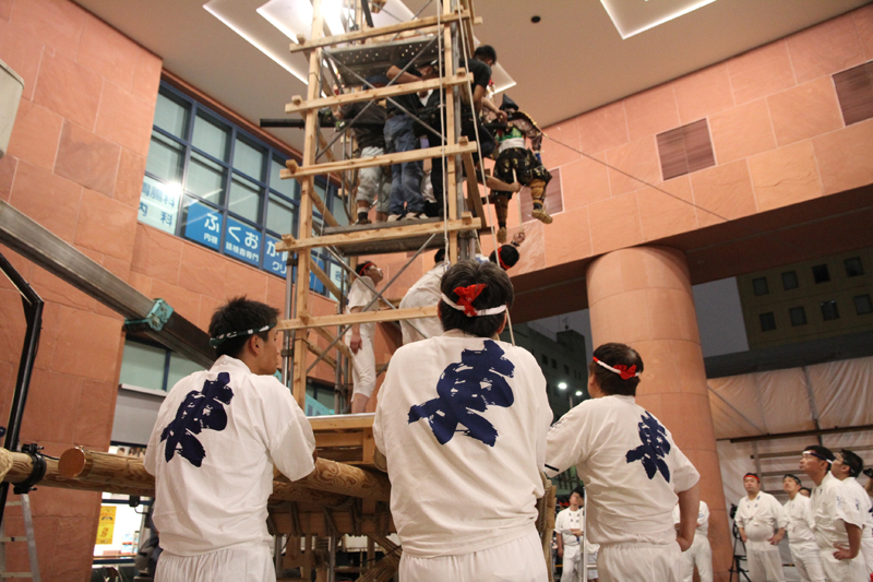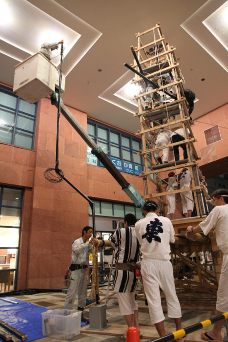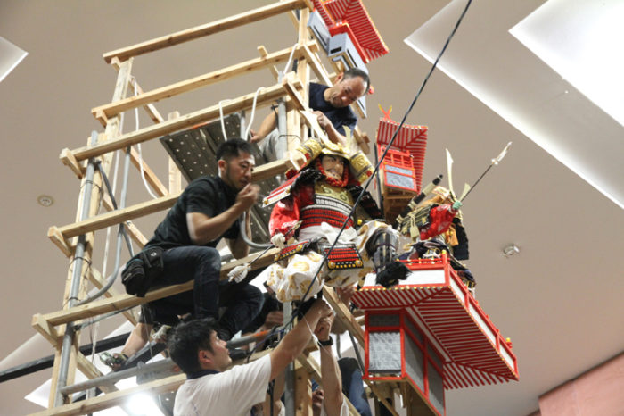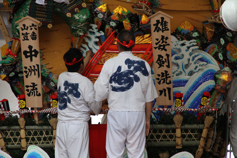 見送りの飾りを担当する溝口人形師の指示に合わせ、男衆が飾りの調整を行い、据え付けていきます。