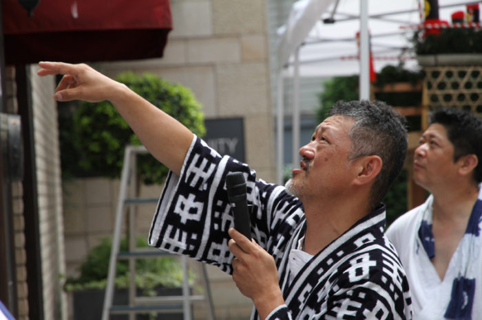 今年から表・見送り共に飾りを担当する白水人形師は、山笠の下から声を上げて矢切の上に上った山大工らに指示を出していきます。