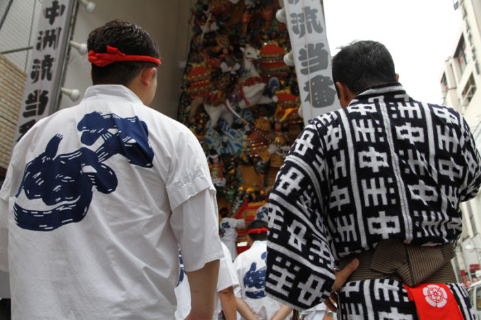 六番山笠 中洲流も6月28日(金)の午前8時より飾り付けがスタート。中洲流の法被を着た男衆が集まり、飾り付けの作業を行いました。