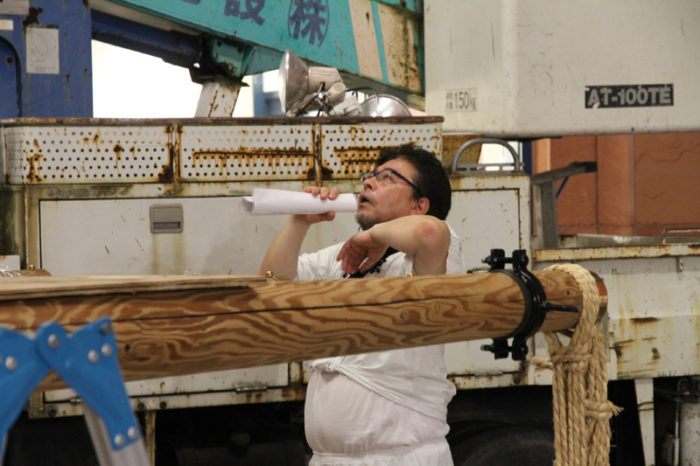 置鮎人形師が、マイクを使って人形飾りの角度や高さの指示を行います。矢切に上った山大工がそれに合わせて人形の位置を修正していきます。