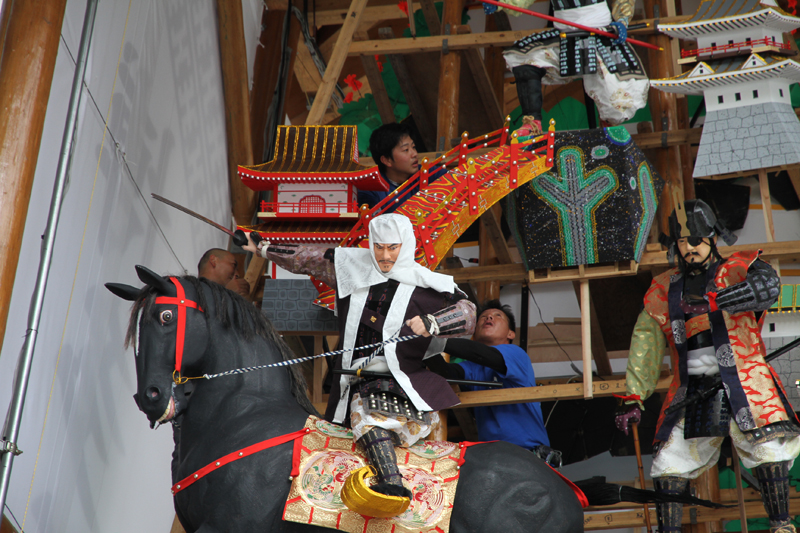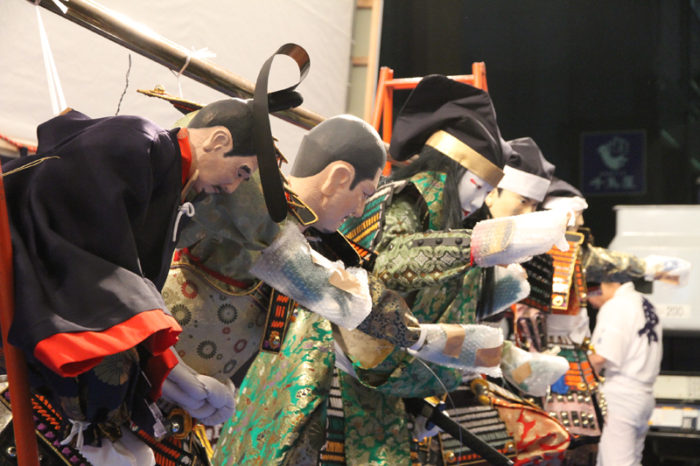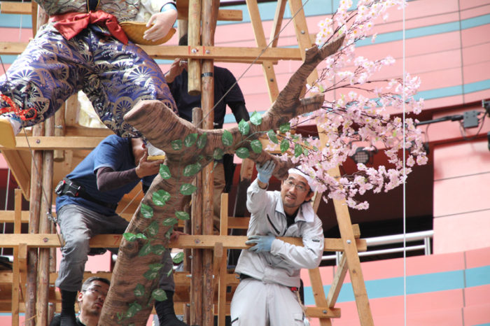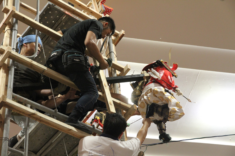 山小屋が無くなったので、東流の飾りや今年から四面飾りに。そのため、人形の配置も自由となり、例年だと山小屋の壁がある位置にも人形を突き出すこともできるようになりました。ダイナミックに飾りを見せる事に評判の白水人形師は、細かく指示を出して人形飾りの位置を調整していきます。