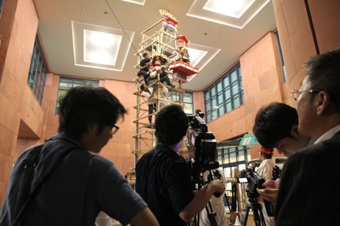 夜遅くとなっていますが、場所が変わった東流の飾り山の初めての飾り付けをテレビクルーも取材に。