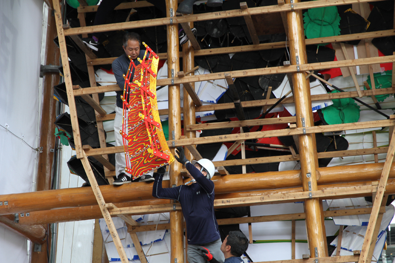 この日の作業は見送りの飾り付けのみ。表側の飾り付けは、29日から行われます。