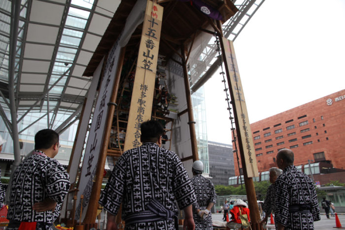 九州の玄関口である博多駅に立てられる十五番山笠 博多駅商店連合会の飾り山は6月28日より飾り付けの作業が始まりました。早朝8時から人形師、山大工、関係者が集まり、まずは見送りの飾り付けがスタートしました。
