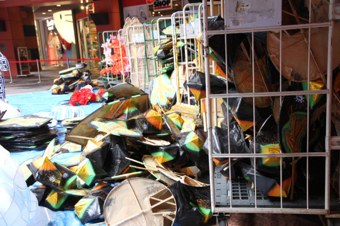 地下一階のサンプラザステージには、通路との境目にロープが張られ、そのロープ沿いに飾りを積んだカーゴが整然と並べられて作業の準備は万端となっています。