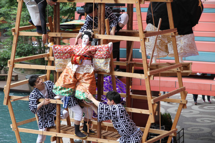 この状態で分かるのは人形の飾り付け方。人形は跳木と呼ばれる木材に取り付けられ、矢切の前にぐいっと出されます。その人形の角度や固定は人形の手足につけられた針金。その針金で細かいい位置調整を行っています。
