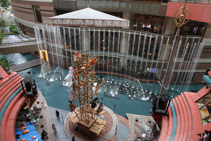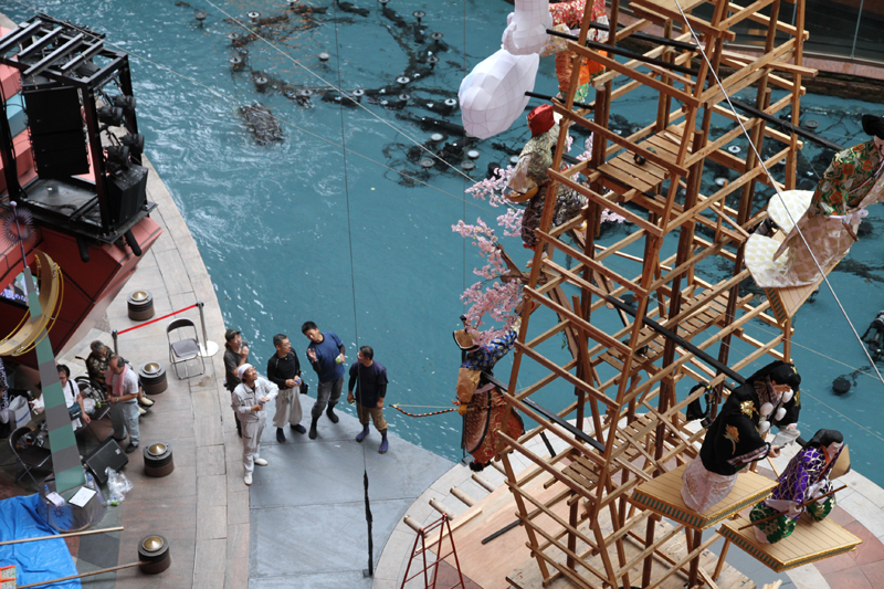 午前10時には1時間に一回のダンシングウォーターショーがスタート。空高く舞い上がる噴水を背景に、飾り付け作業が再開しました。