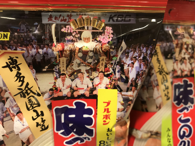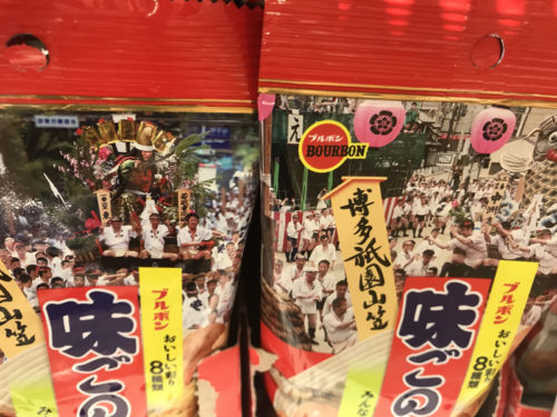 まずお馴染みのお菓子「味ごのみ」。こちらパッケージが博多祇園山笠仕様の物が発売中です。レガネットやレガネットキュートなどで発売されているのを確認しました。
