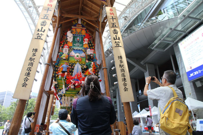梅雨入り以来、すっきりしない日が続く博多の町ですが、本日7月5日(木)は久々に太陽の姿を見ることができた一日となり、飾り山の前では、山笠見物を楽しむ姿を多く見かけました。