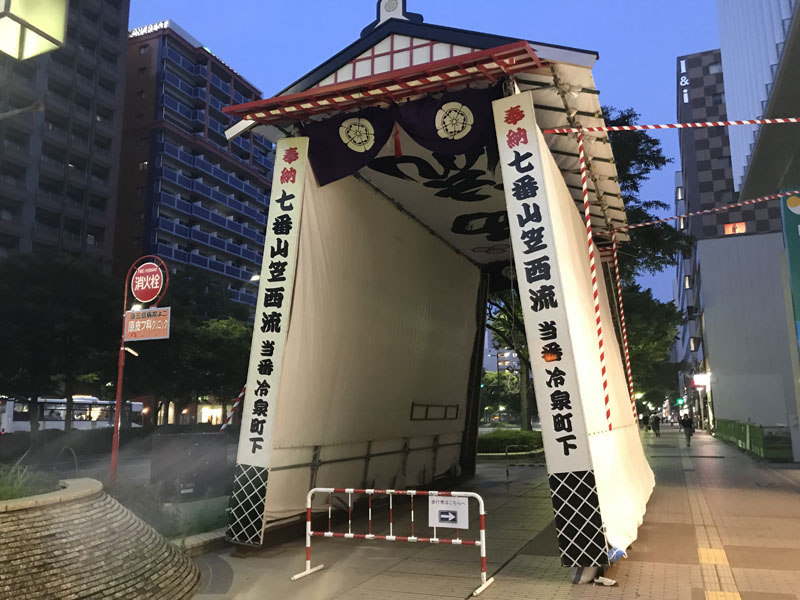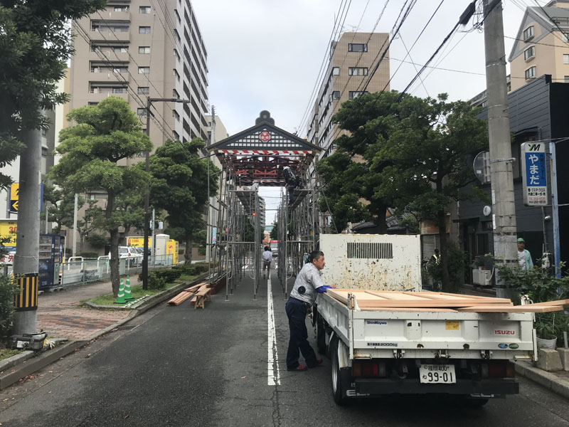 山笠期間に入りすでに4日目。来週火曜日10日からは「動」の山笠に変わるため、七流は「動」の山笠の準備が進められており、舁き山の山小屋建設や棒締めなどが行われています。
