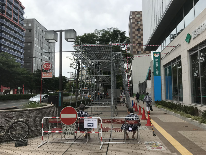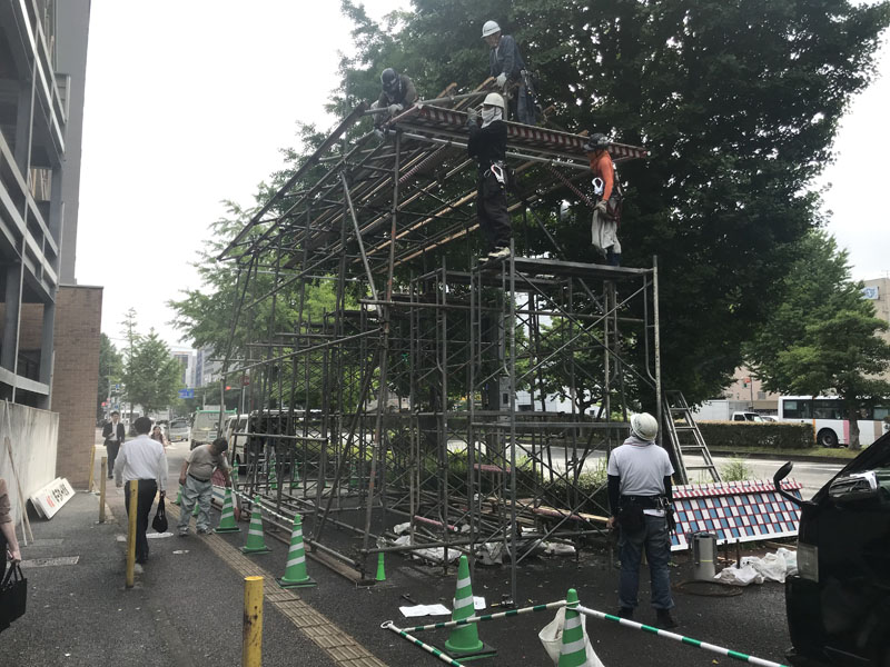 恵比須流では、早朝より山小屋の建設が行われています。今年は路上に山小屋が建てられます。