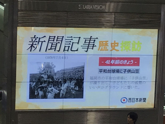 ソラリアビジョンの西日本新聞の「新聞歴史探訪」によると、41年前の今日は「平和台球場に子供山笠が舁き入れ」られた日だそうです。思わず写真を一枚。