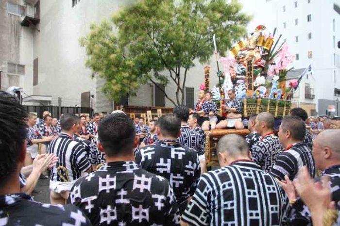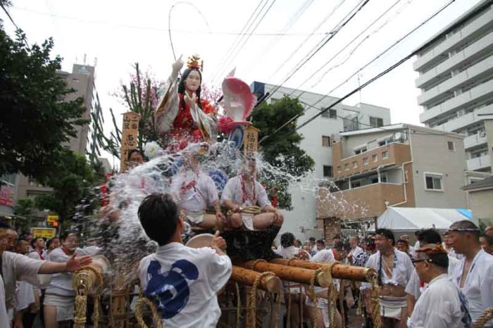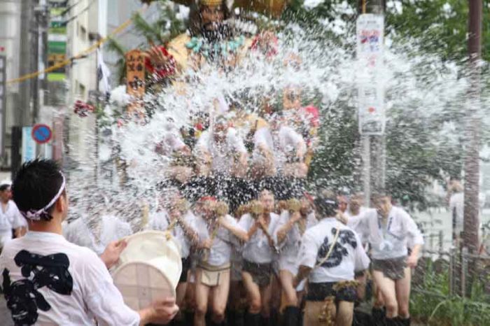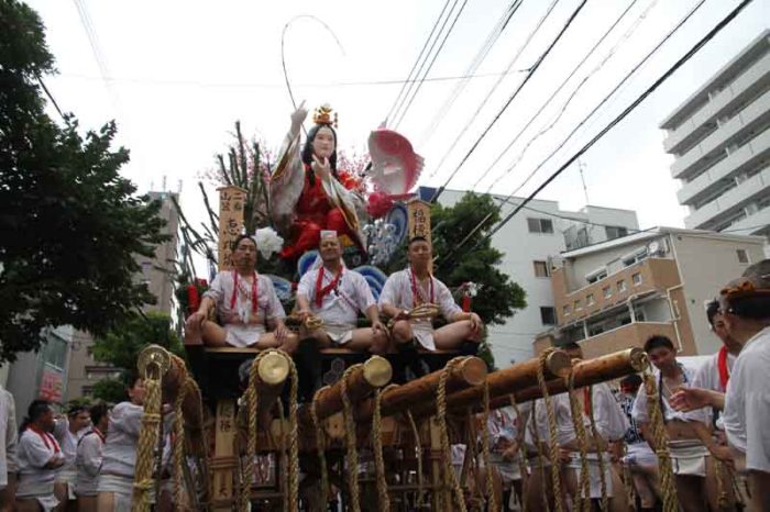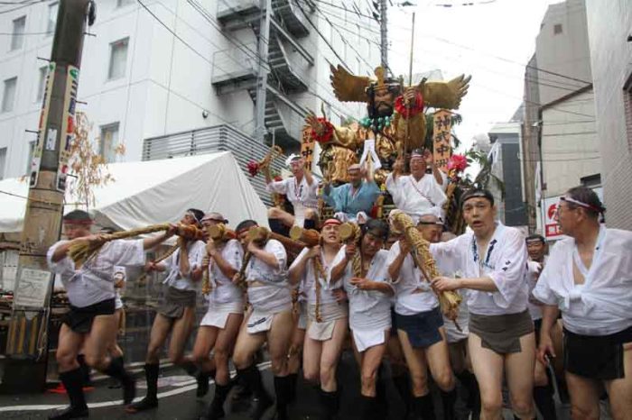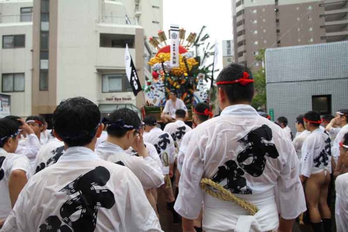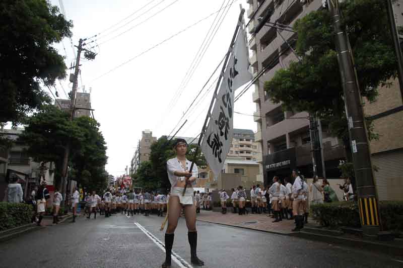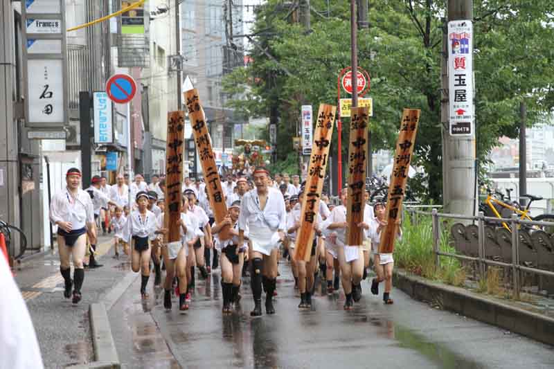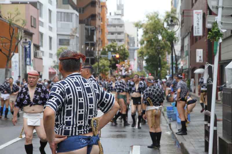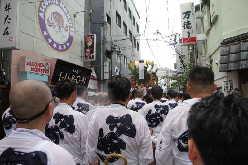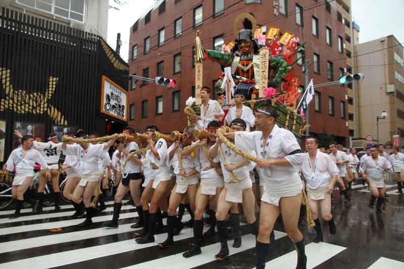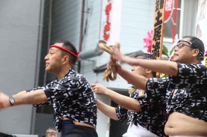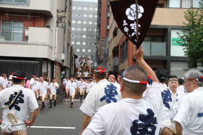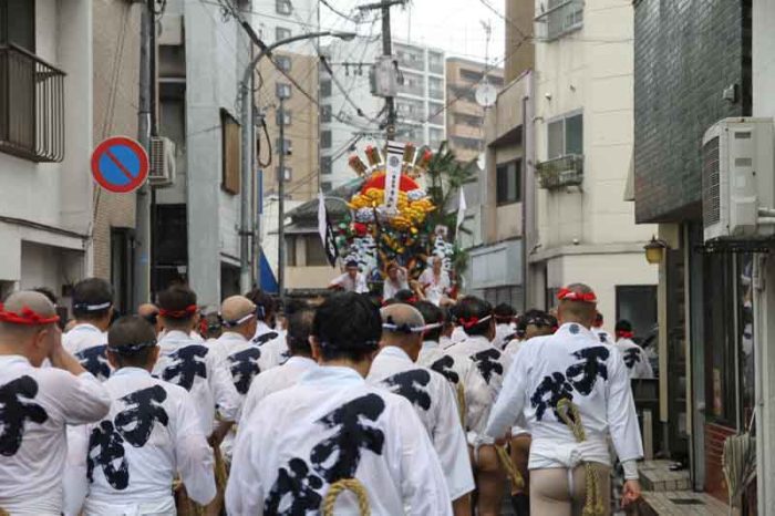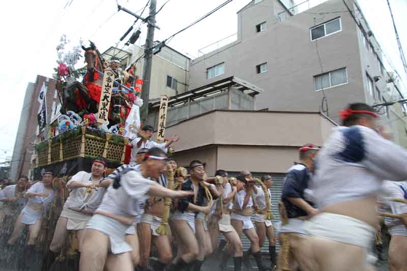 18時、恵比須流の流舁きがスタート。一気に昭和通りを横切り、明治通り沿いの各町の道を舁き回ります。