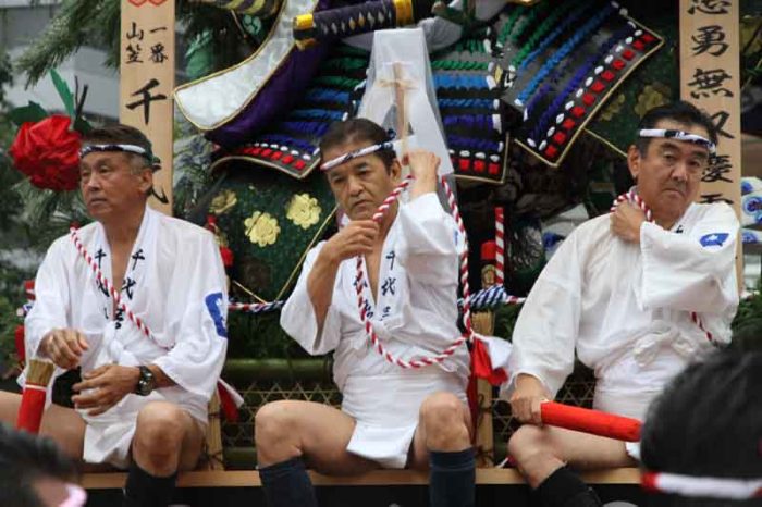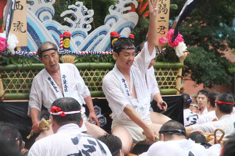 2001年(平成13年)に45歳で総務を経験して二度目の総務を務める松本忠人総務が台上がりし、祝いめでたを謳い上げます。歌い終わると千代流の舁き山が流域に飛び出していきました。