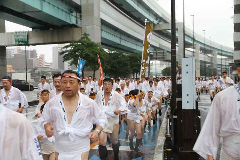 雨が降り注ぐ中、午後4時より今年の一番山笠 千代流が流舁きを行いました。勢水はまだ浴びていないのに、すでに水法被はぐっしょり濡れています。
