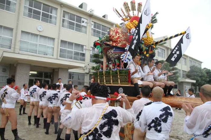 コースの途中にある千代小学校に舁き山を舁き入れて表敬訪問。手一本が入れられます。