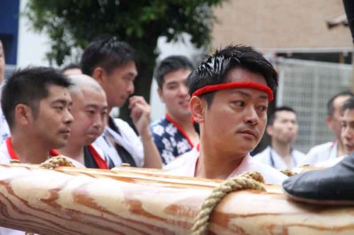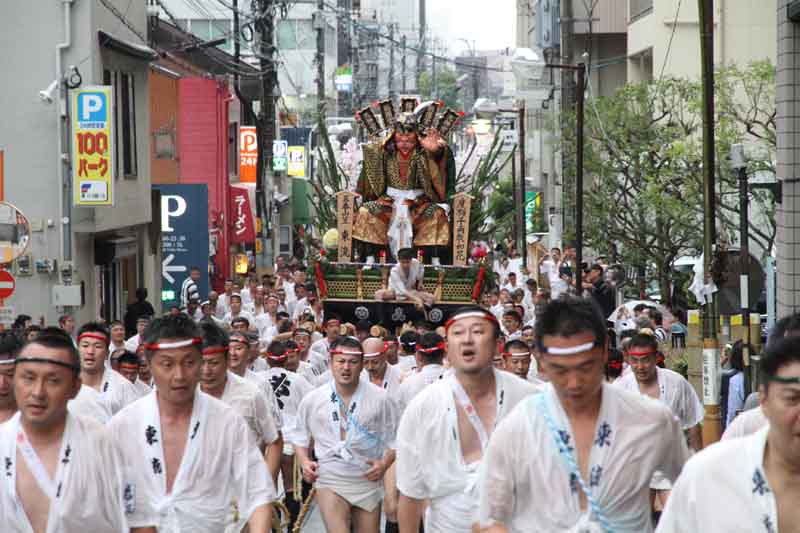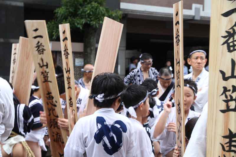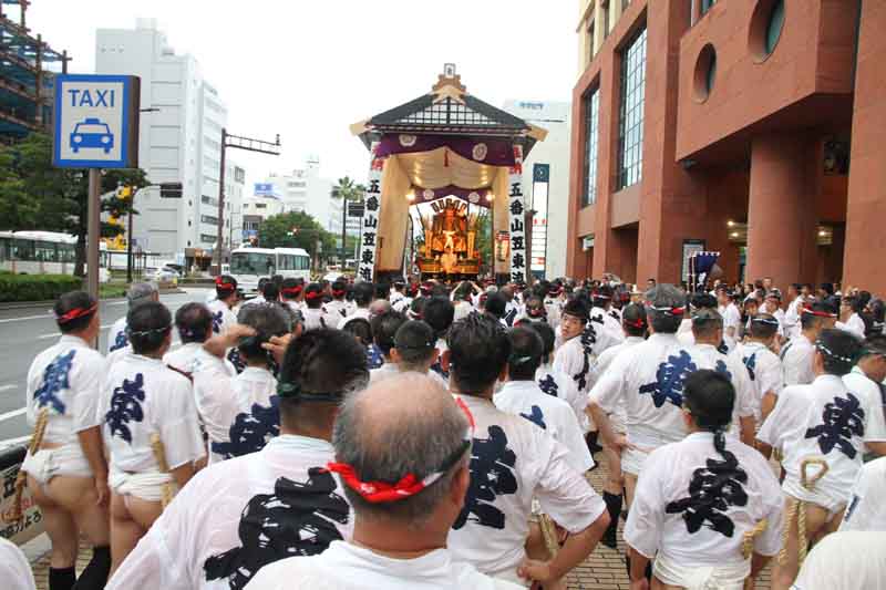 見送りから見降ろして鼓舞する恵比須様の力を受けて、明治通り沿いの道を舁き回ったのち、舁き山は上竪町方面へと向かいました。