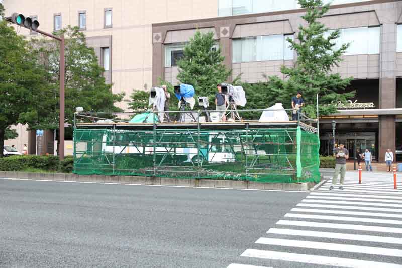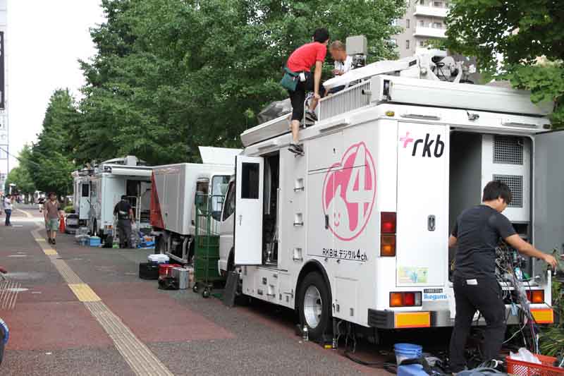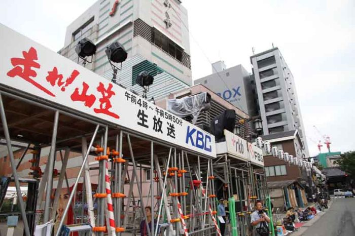 櫛田神社の清道の前や廻り止めの前では中継の準備が進められており、