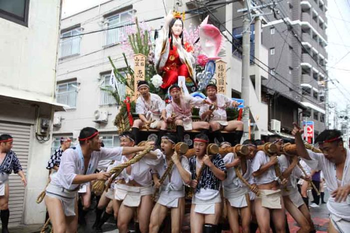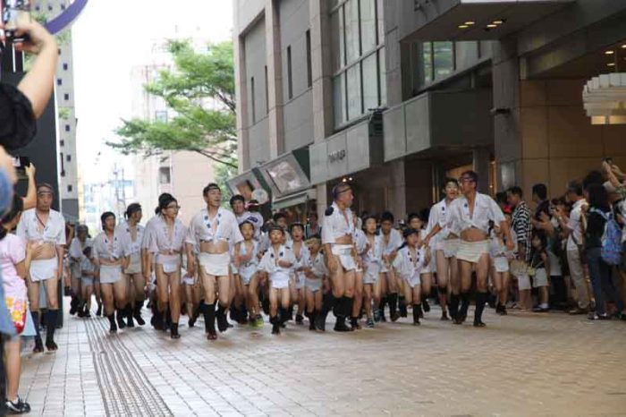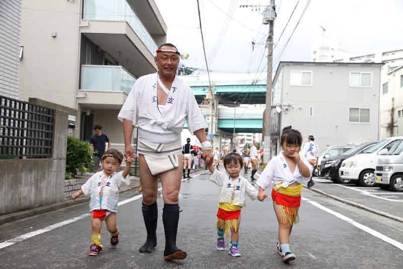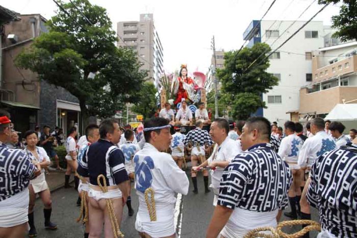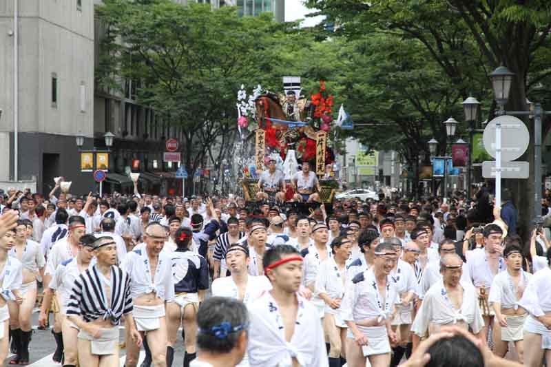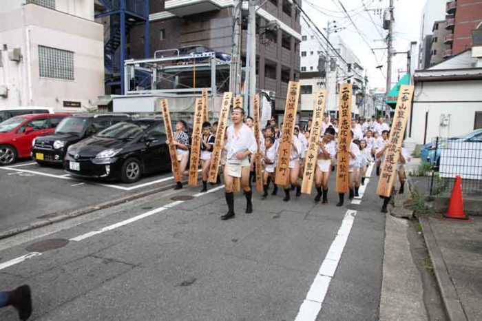 土居流は午後5時に舁き出し。櫛田神社で櫛田入りを行った後、上川端商店街に入った後、土居通りで追善山を執り行いました。