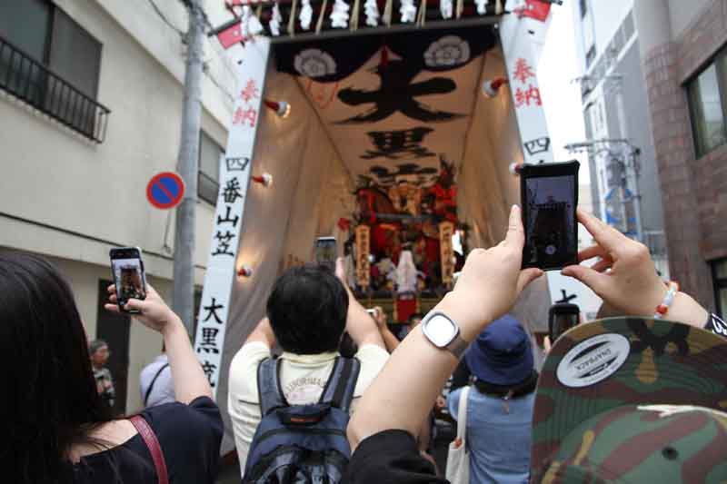 恵比須流は午後4時からの舁き出し。今日は日曜とだけあって、流舁きを見物しようと集まった見物客がどの沿道にもたくさん詰めかけおり、今年最後の流舁きを楽しみました。