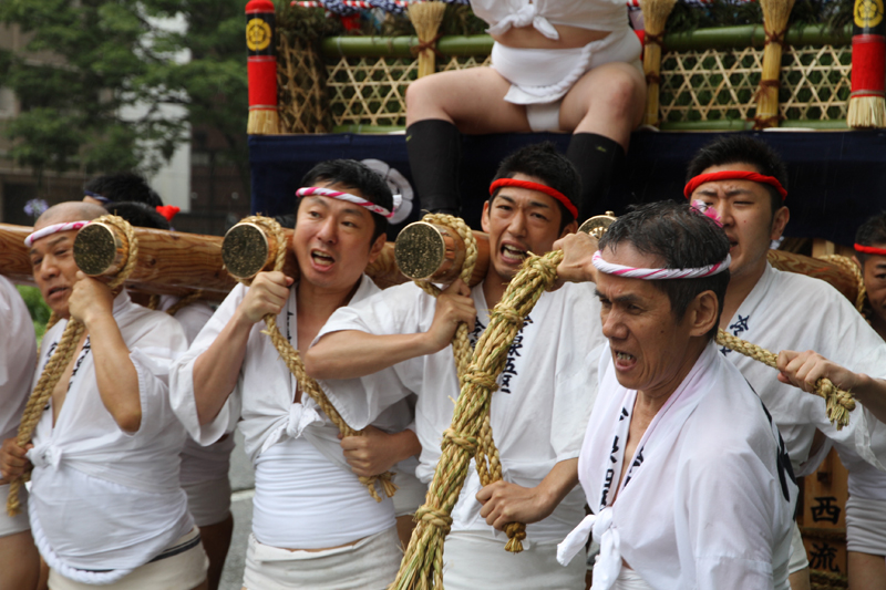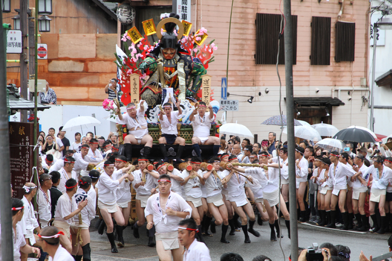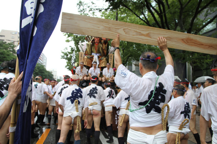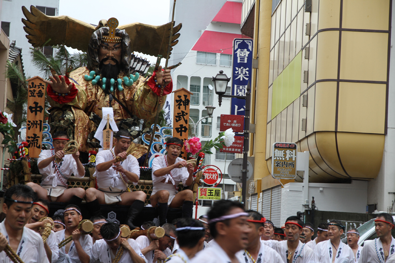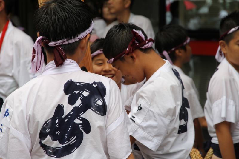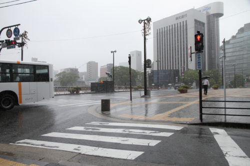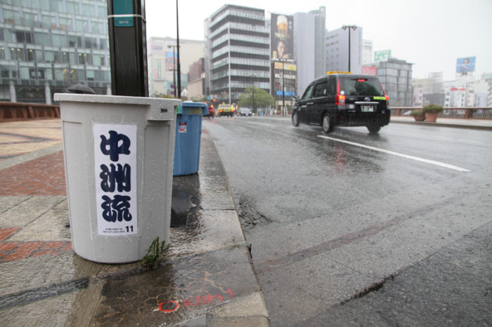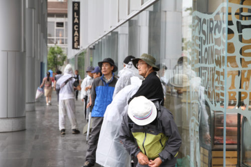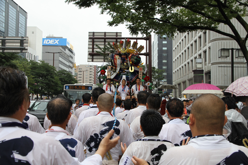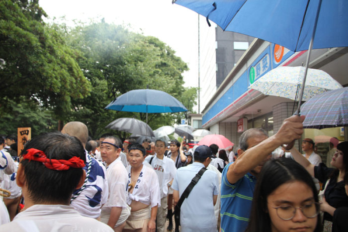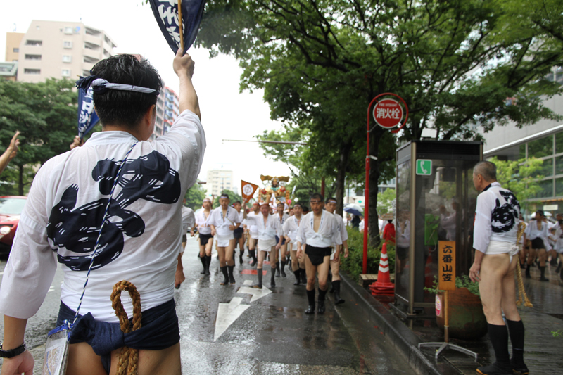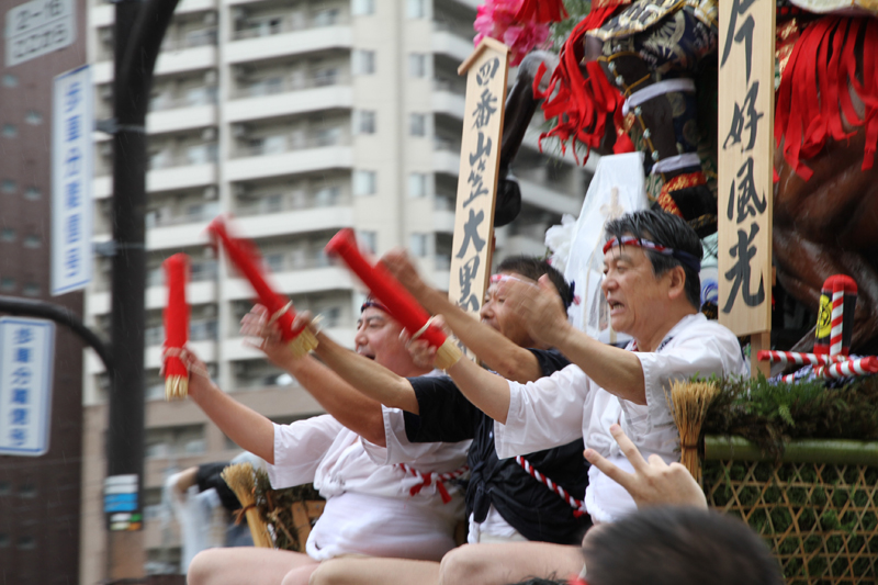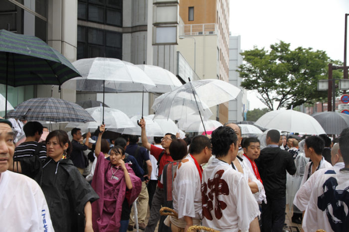 朝から降り続く雨は一向に止む気配がなく、お昼を過ぎたら雨脚が強くなるという展開に。晴れの日の集団山見せの時は、人気スポットである西大橋は早くからカメラマンが待っているのですが、午後2時になってもさすがにこの雨だとすぐには並びたくはない模様。近くのビルの軒先で雨脚が弱まるのを祈りながら、雨宿りをしています。