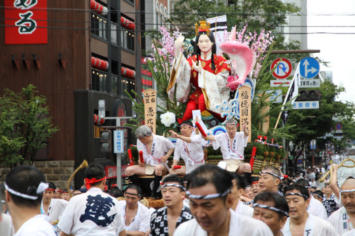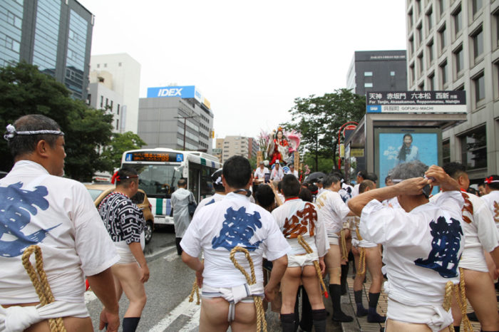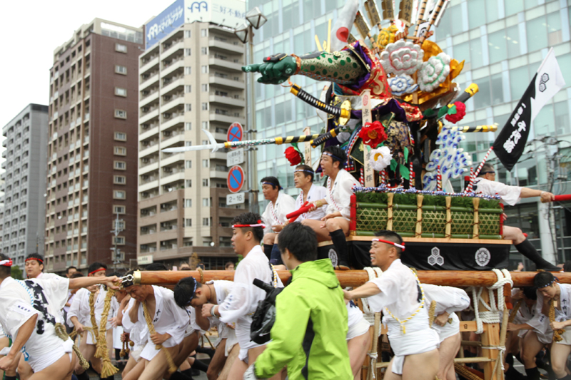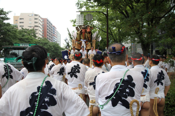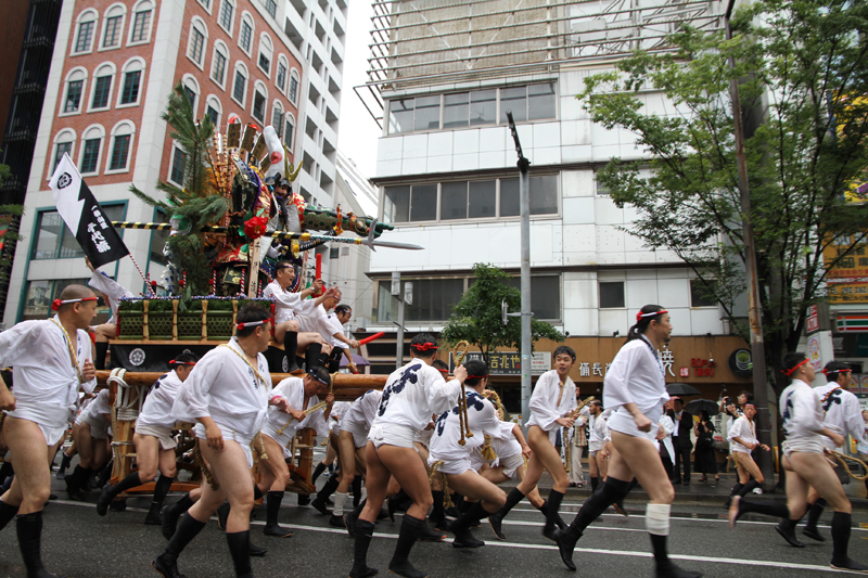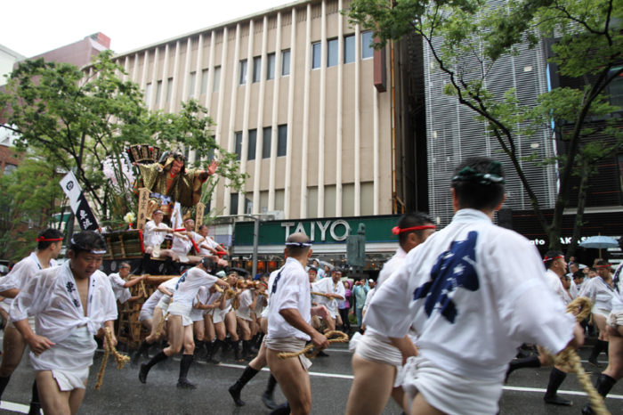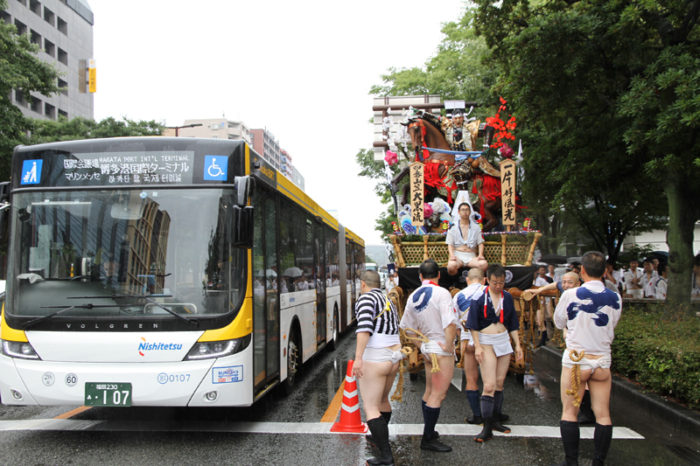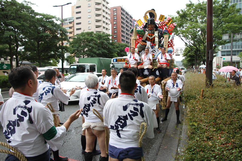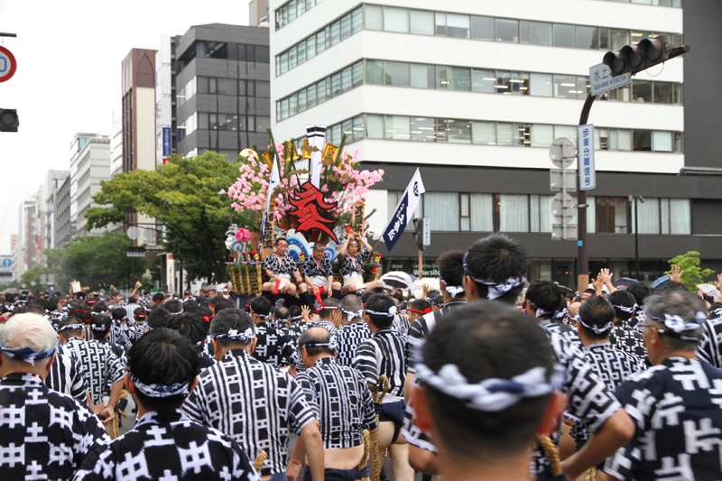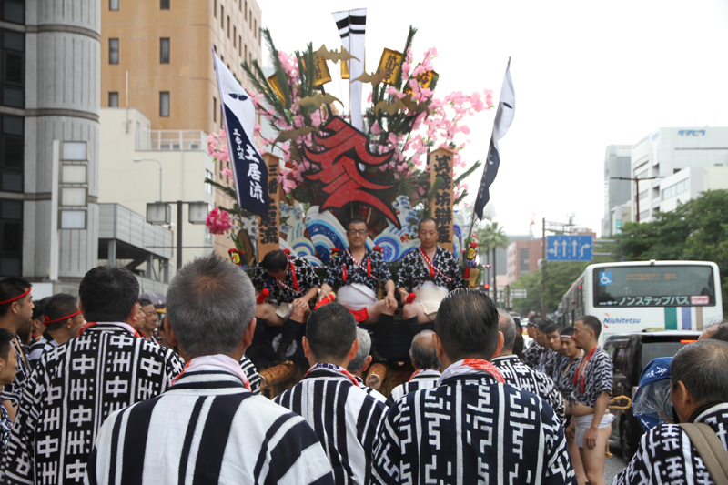 全流が福岡部に渡り切ったら、今度は復路が始まります。舁き山は再び西大橋を渡り、博多部へ戻っていきます。