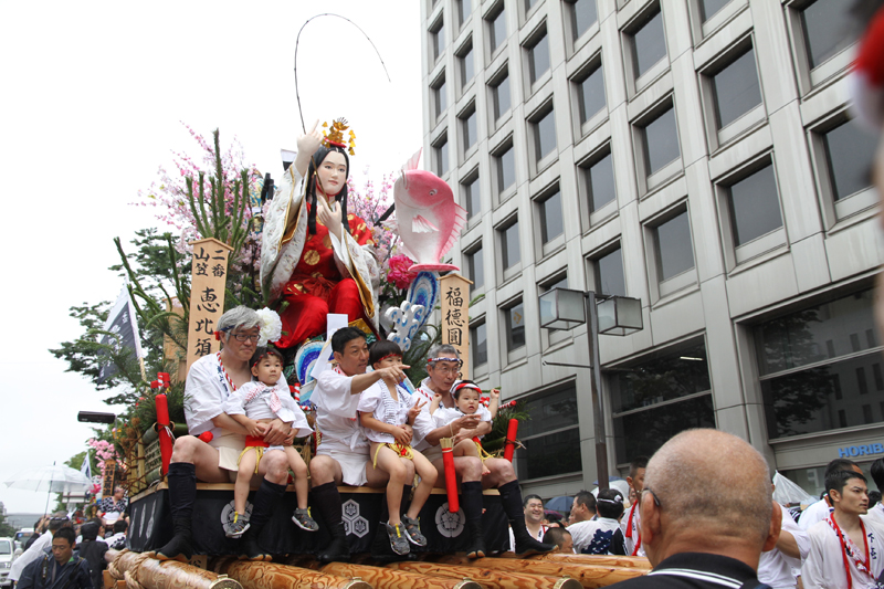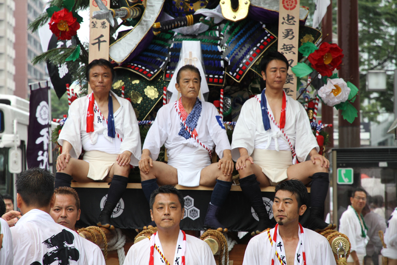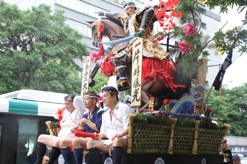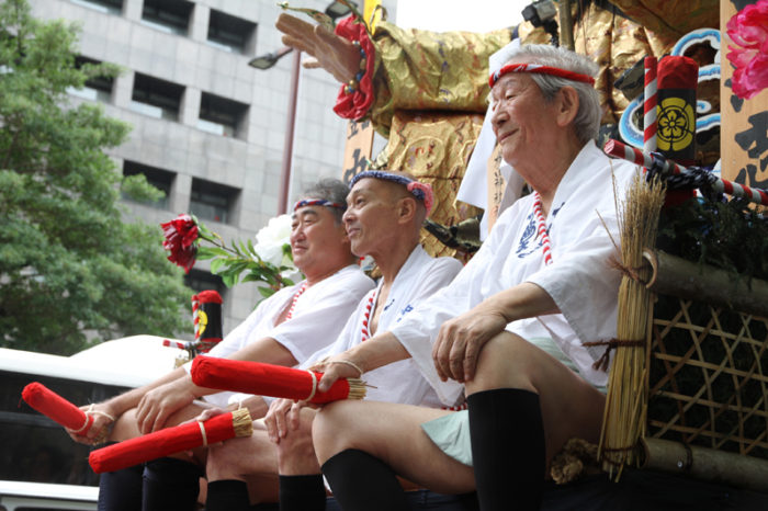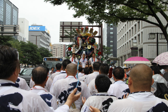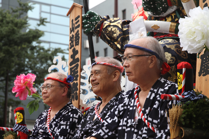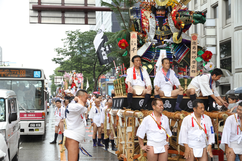 午後2時半になると、各流の舁き山が次々とスタート地点である呉服町の交差点に到着。呉服町交差点周辺の歩道は混雑状況になっていきます。